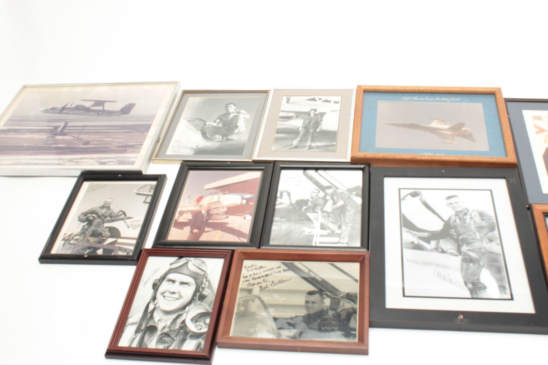 Lot of 14 jet era aviation framed photos, many signed by pilot like Col. Reto Sayer, “Ozzie” Oseguera, Tony LeVier, Lt. Chrystal A. Lewis, Ed Heinemann, Bob Gillon, Jerry Johnson and Major H.T. Bailey. From theBill Bettis Nieuport 17 Restaurant collection. Est.: $200-$400.