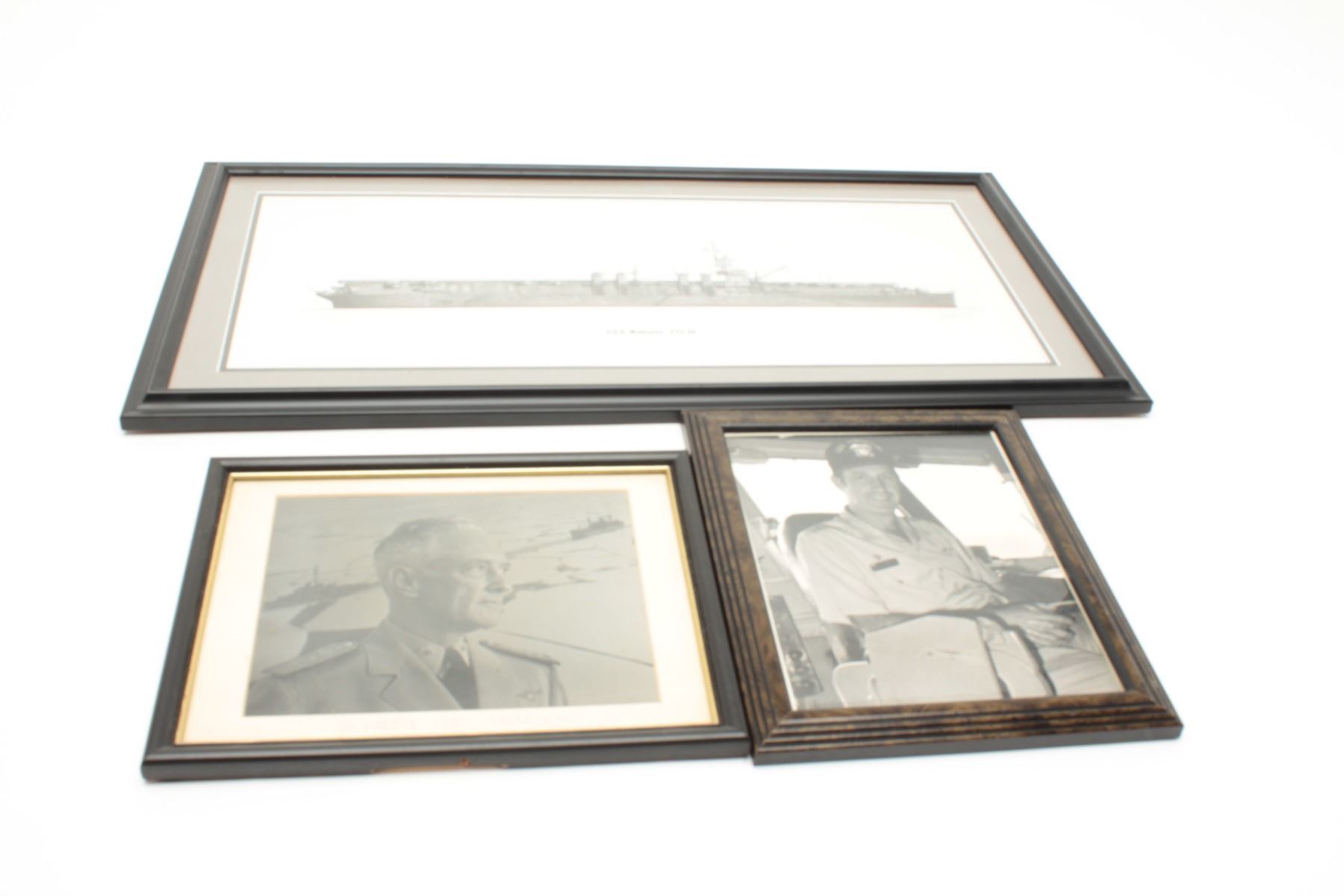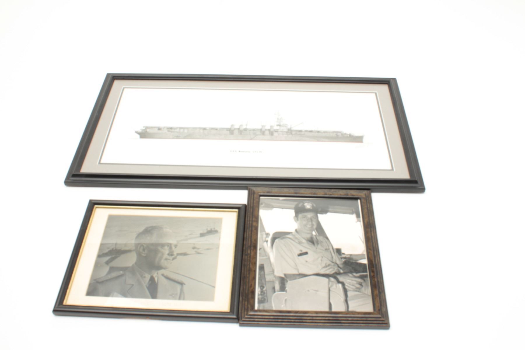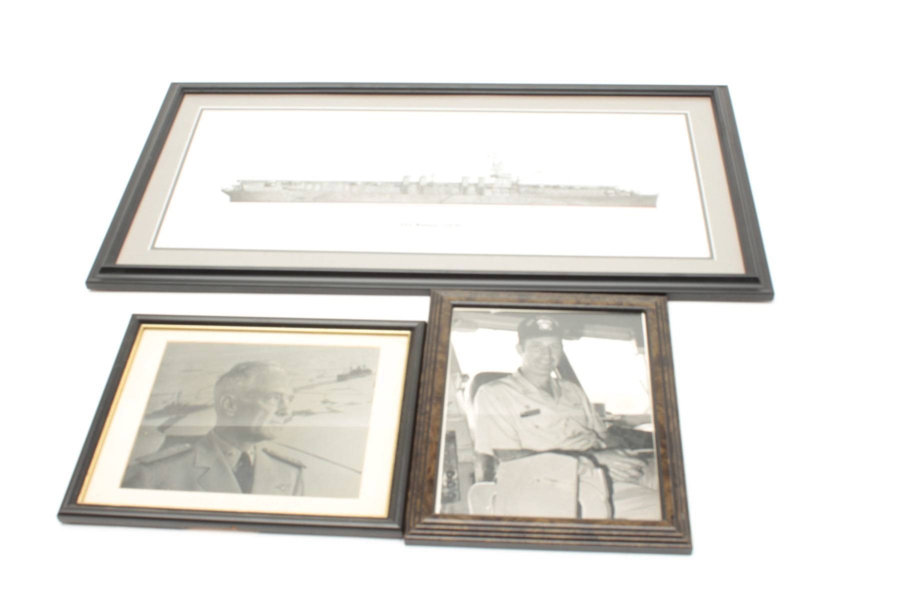 Lot of 3 framed U.S. Naval related items including a hand signed print of the U.S.S. Monterey CVL 26, a photo of Richard E. Byrd, RADM USN, and a photo of an officer on the U.S.S. Forrestal. From the Bill BettisNieuport 17 Restaurant collection. Est.: $75-$100.