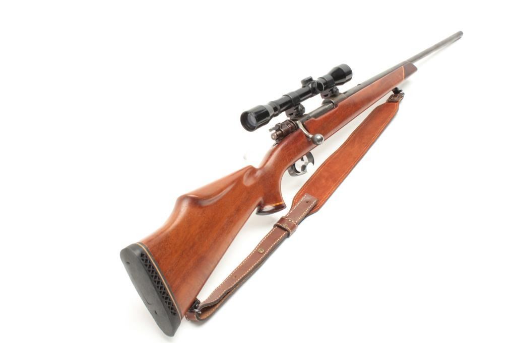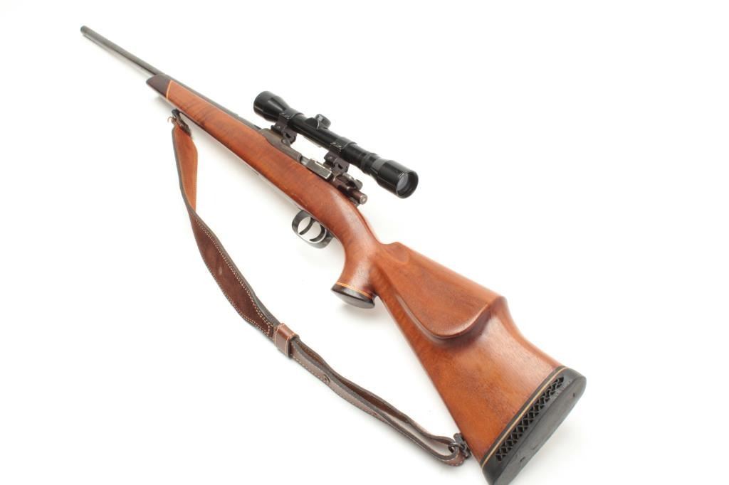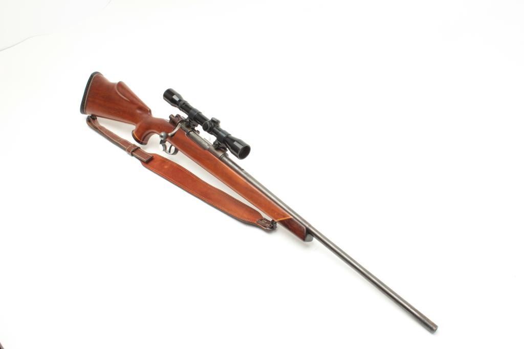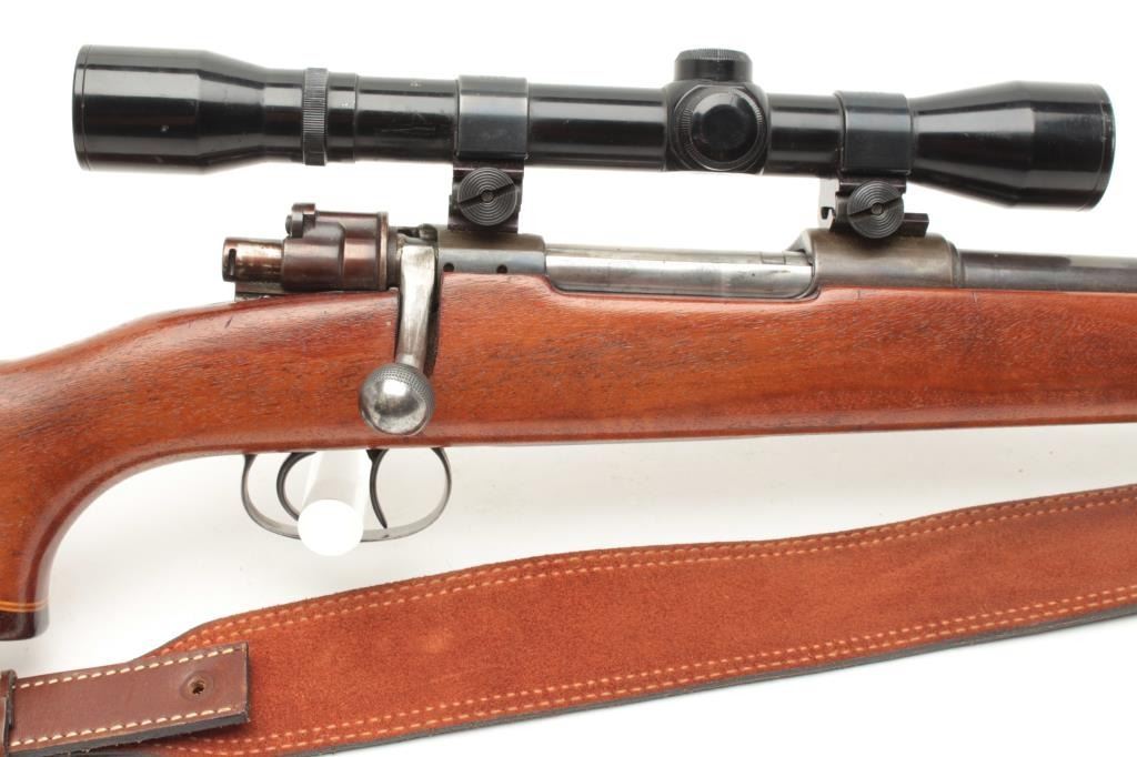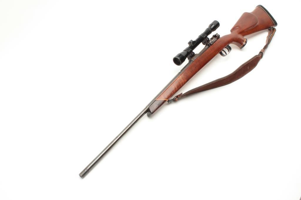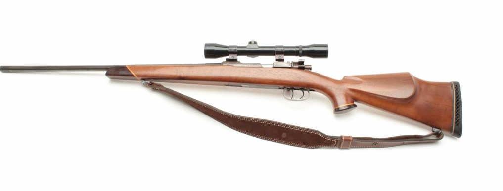 Sporterized Mauser rifle in 8mm caliber with Danzig arsenal marks on the action, S/N 2756 with double set triggers. Springfield 4x scope on Weaver mounts. Plain wood stock along with quick detachable swivels andsling. Recoil pad added. 25” turned down military barrel and 46” overall. (C&R) Est.: $250-$500