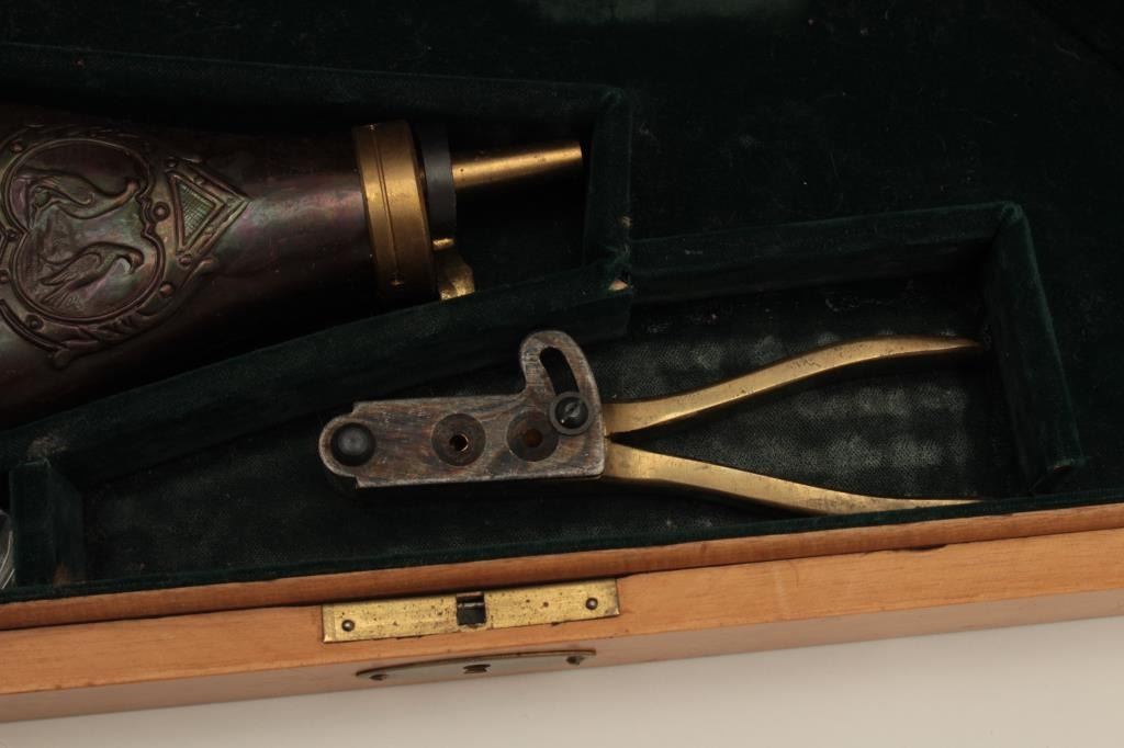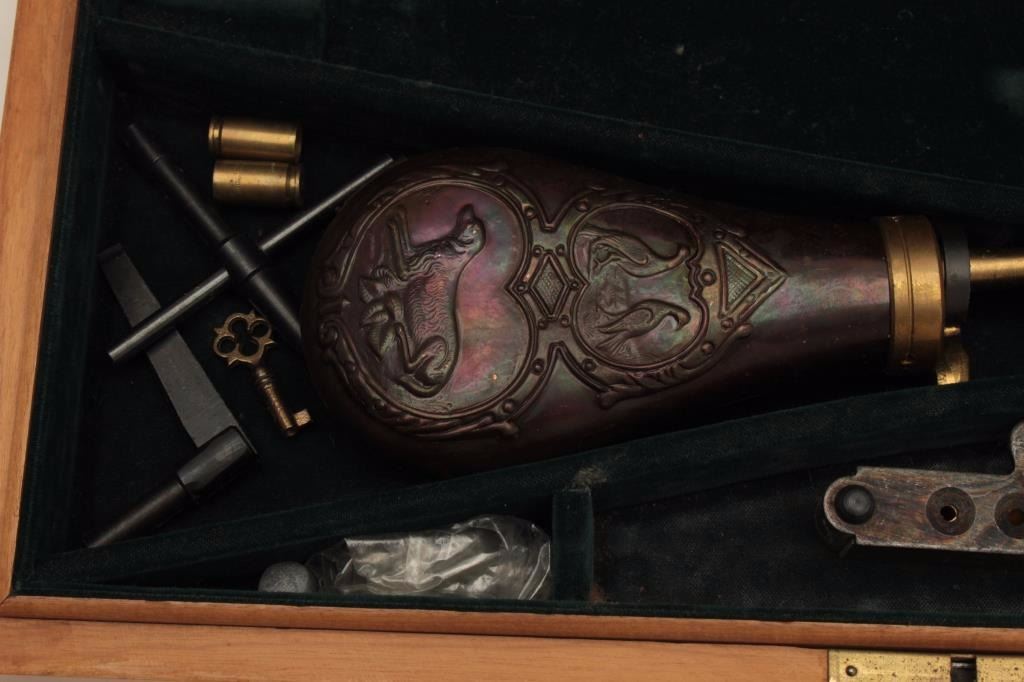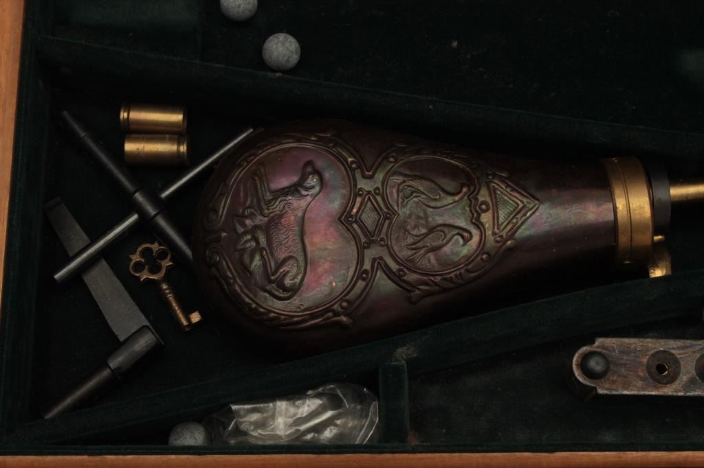 ASM Cased reproduction 1851 Navy percussion revolver, .36 caliber, serial #73718. The pistol is in very good overall condition with a 7 ½” octagon barrel. The barrel and cylinder retain nearly all of their bluedfinish while the hammer and rammer are beautifully case colored. The frame is polished brass with small handling marks noted. The smooth wood grips are in very good condition with small storage marks. The pistol is cased in a green velvet lined, partitioned modern wood case with mold, powder flask, percussion caps and other accoutrements. Est.: $200-$400.