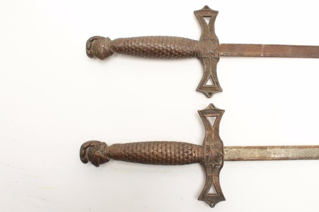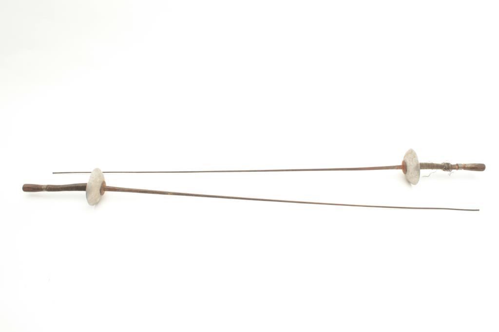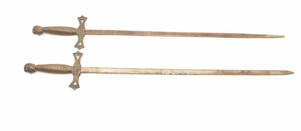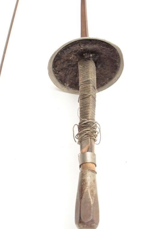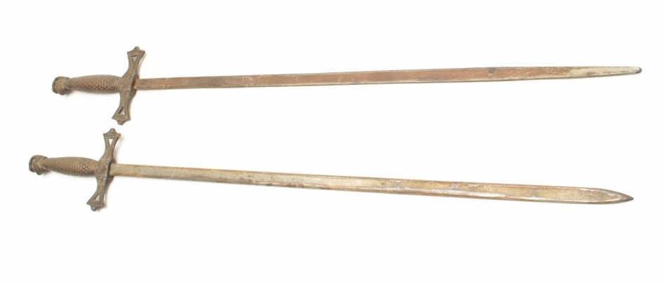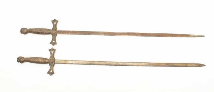 Lot of four European swords. The lot includes two fencing style, rapiers and two ornate guard style swords. The rapiers are approximately 43” in length with cord wrapped wooden handles in fair overall condition.The guard swords are likewise in fair condition with 24 ½” blades and an overall length of 30 ½”. The cast hand guard features a textured scale pattern on the handle and a knight’s head at the pommel.The blades show light to moderate surface rust and scabbard wear. Est.: $150-$300.