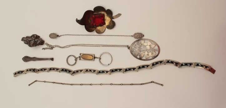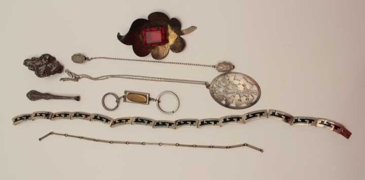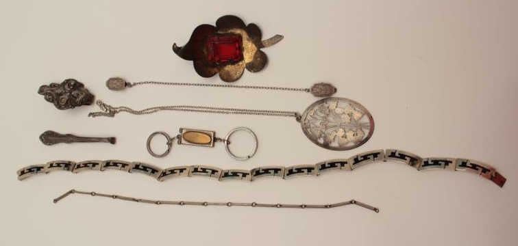 Lot of antique and vintage silver jewelry. Leaf pin, pendent in leaf design, old Taxco Mexican necklace with black enamel in 1940’s style, tie tac from baby spoon, key chain, chain with clips (bookmarks?), German silvermarked roach clip from S.F. 1960’s. Estate consigned. Est.: $175-$350