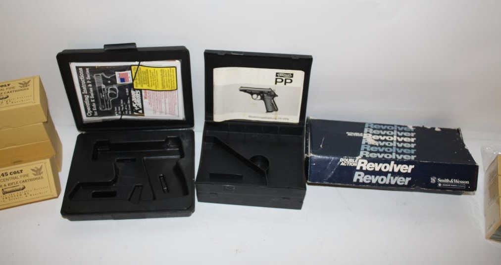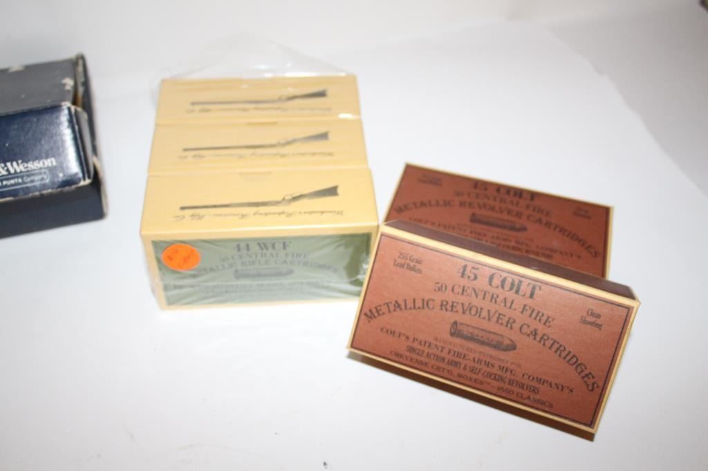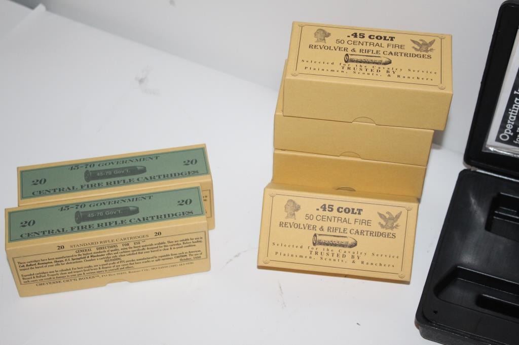 Lot of 4 misc. empty handgun boxes plus 12 misc. empty reproduction cartridge boxes for .44WCF, .45 Colt and .45-70 Gov’t cartridges. Est.: $50-$75.