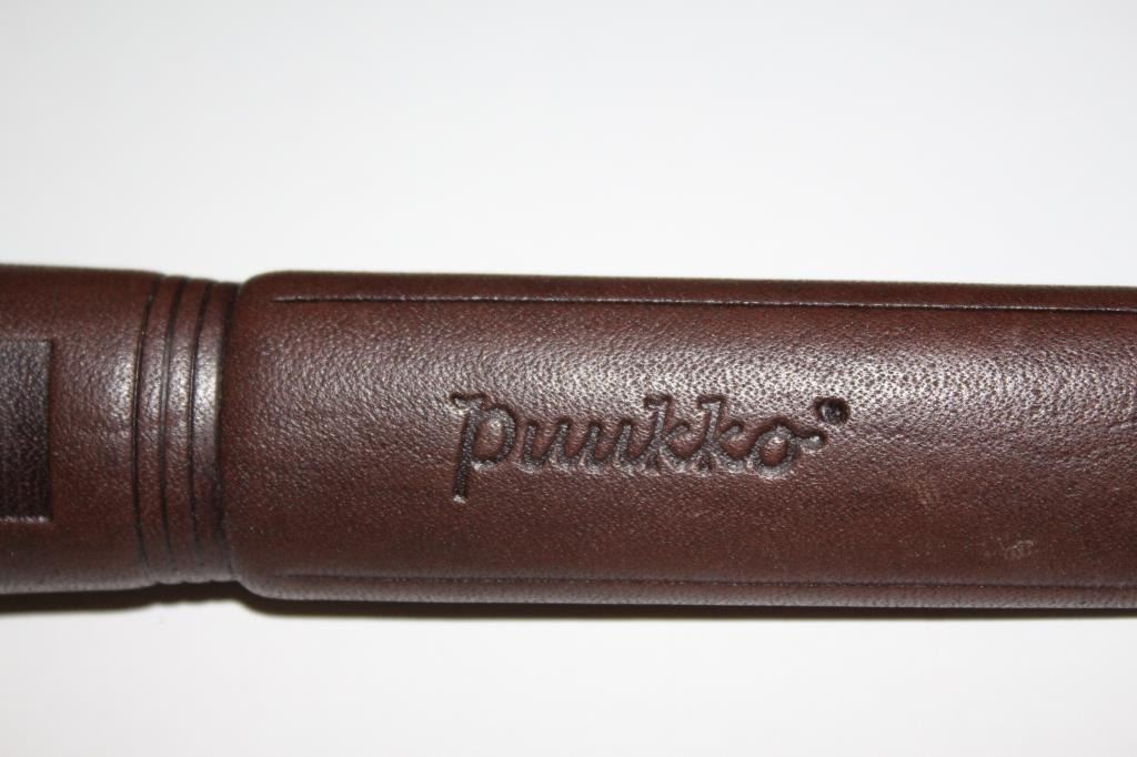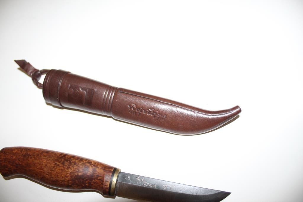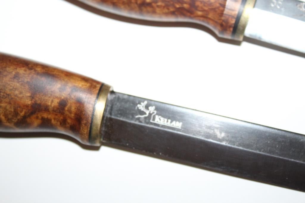 Lot of 2 Finnish side knives in traditional North European style with ¾ scabbards 1 marked and both are marked “Kellam”. One measures 9 ½” overall with a 5” blade and the other measures 8 ¼” overall with a 3” blade. Both have high grade burl grips. Almost fine condition. Est.: $150-$300