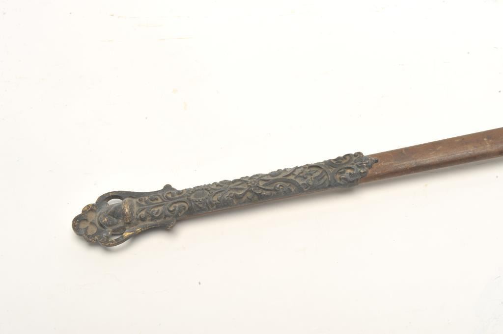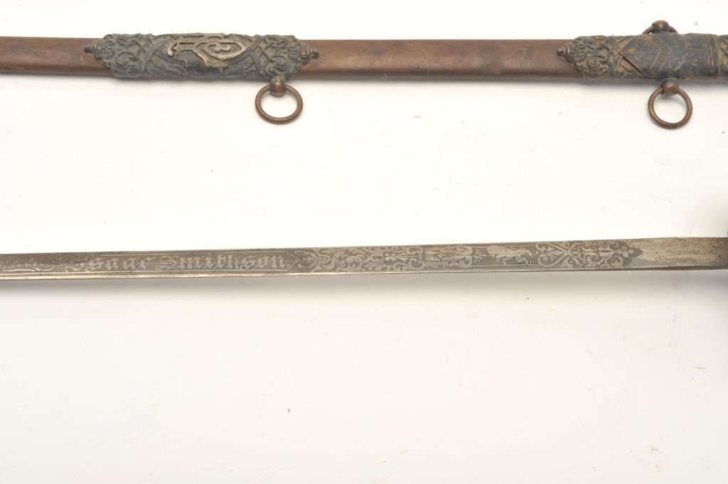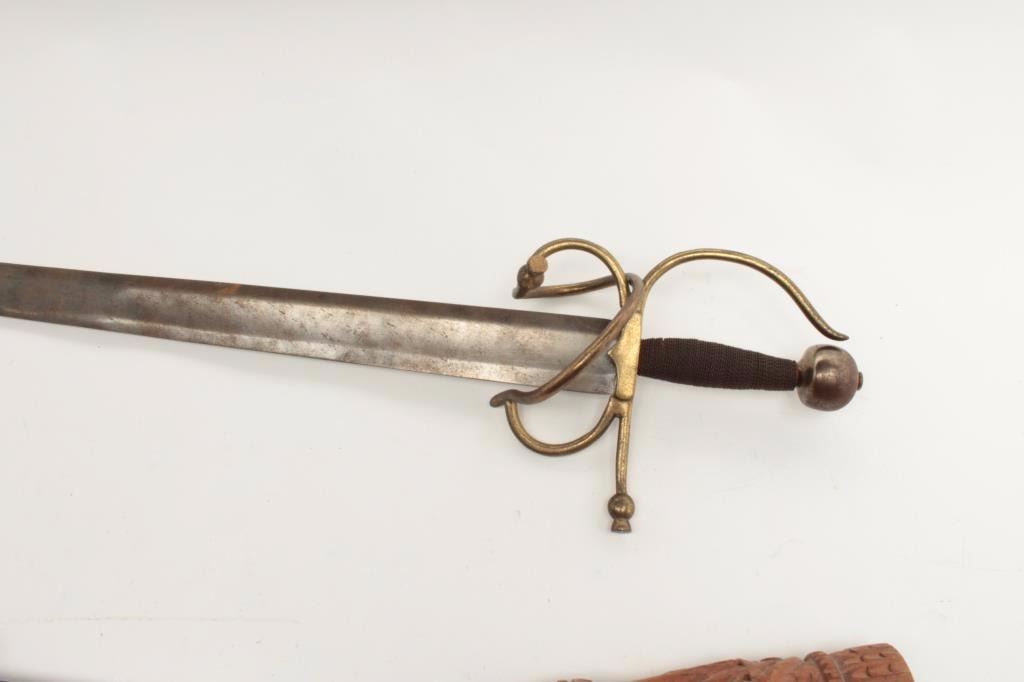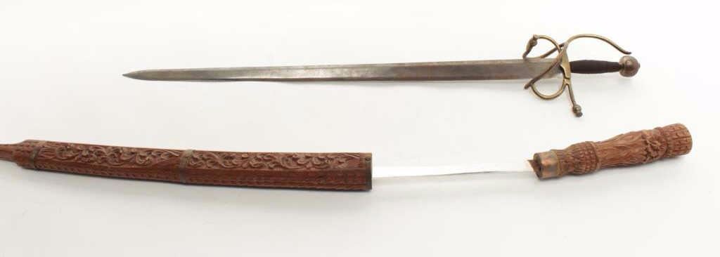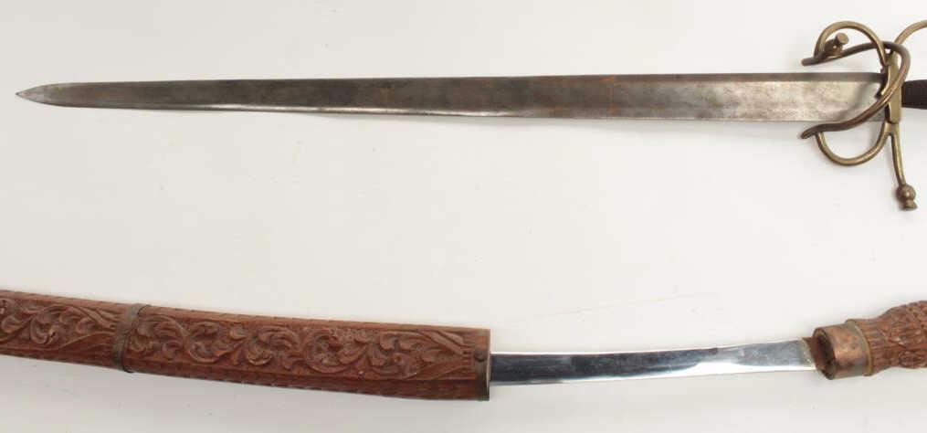 Lot of three swords including: a lodge sword, Asian style sword in carved wood scabbard and a knightly reproduction sword. All three swords are in good overall condition. The lodge sword is ornatelyengraved with an overall length of 34”. The Asian style has a 22” blade with sharpening and scabbard wear and an overall length of 32”. The knightly sword has a 33” straight blade with light surface rust and an overalllength of 39” with a brass hand guard and wire wrapped handle. Est.: $150-$300.