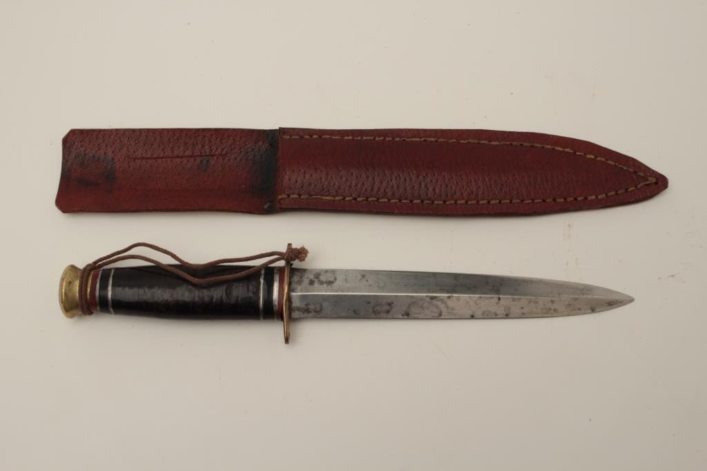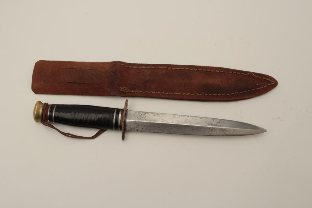 Lot 1790 Private purchase WWII era fighting knife by “Wheatley Bros, Sheffield, England” with original shea