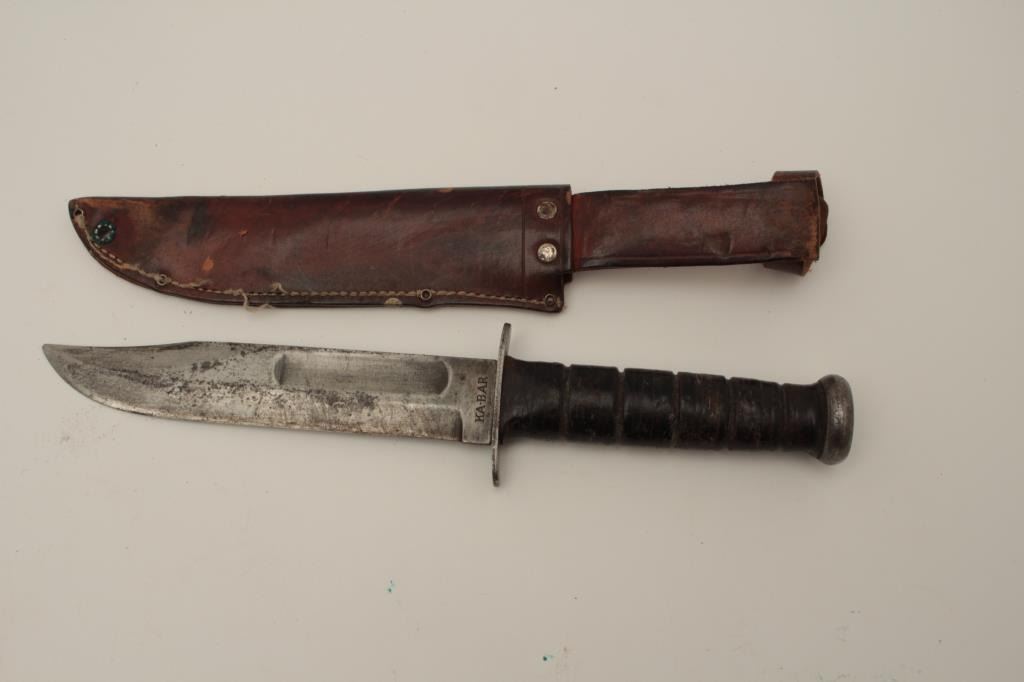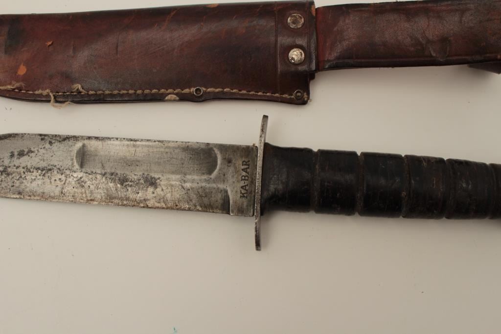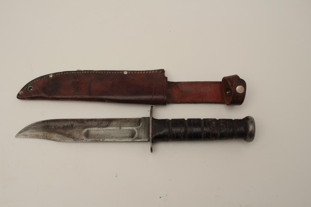Ka-bar marked U.S. military knife with no Orlean, N.Y. Navy or U.S.M.C. marking. No. 1 early no pin variation (Refer Cole III Pg. 7). Fold over long scabbard. Good used and carried condition. Est.: $200-$400