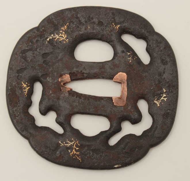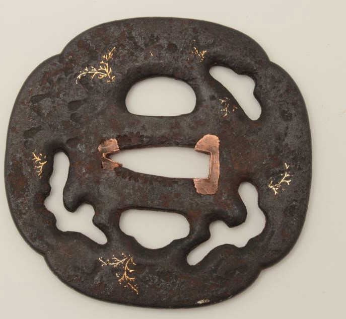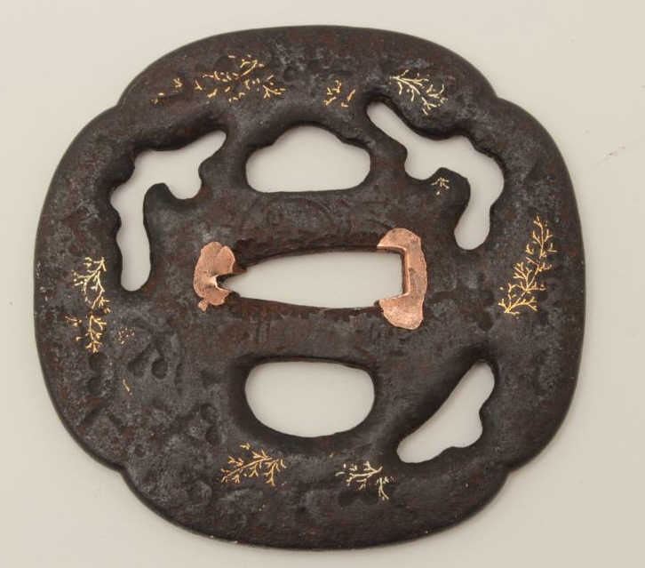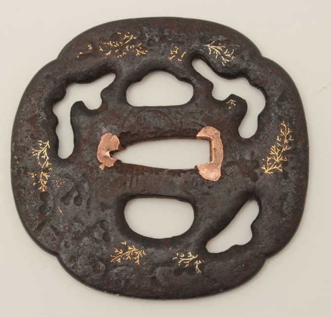 Lot 1796 Large pierced ancient iron tsuba inlaid with gold sprays. Good patina. 200-400 years old. EST:$200