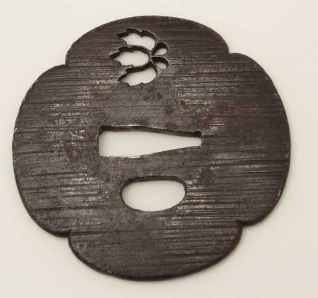 Large iron tsuba well pierced with imperial mon and chiseled surface. 200-400 years old. EST:$150-$300