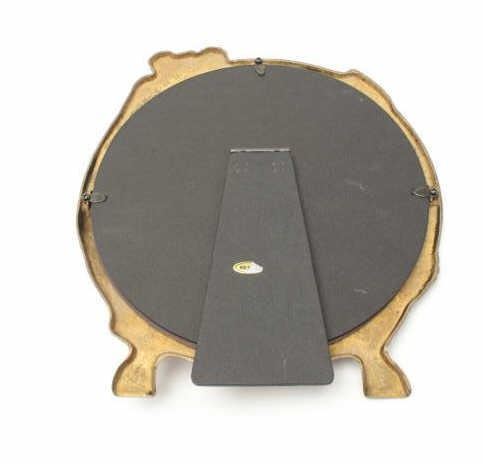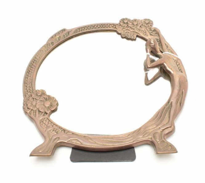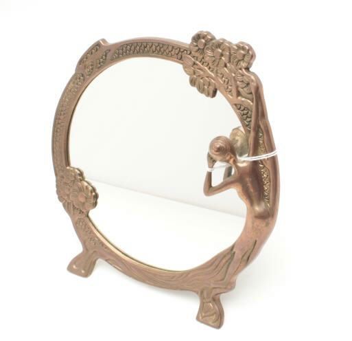 Lot 1804 Brass woman’s vanity table top mirror, approximately 10” in diameter, showing woman and floral des