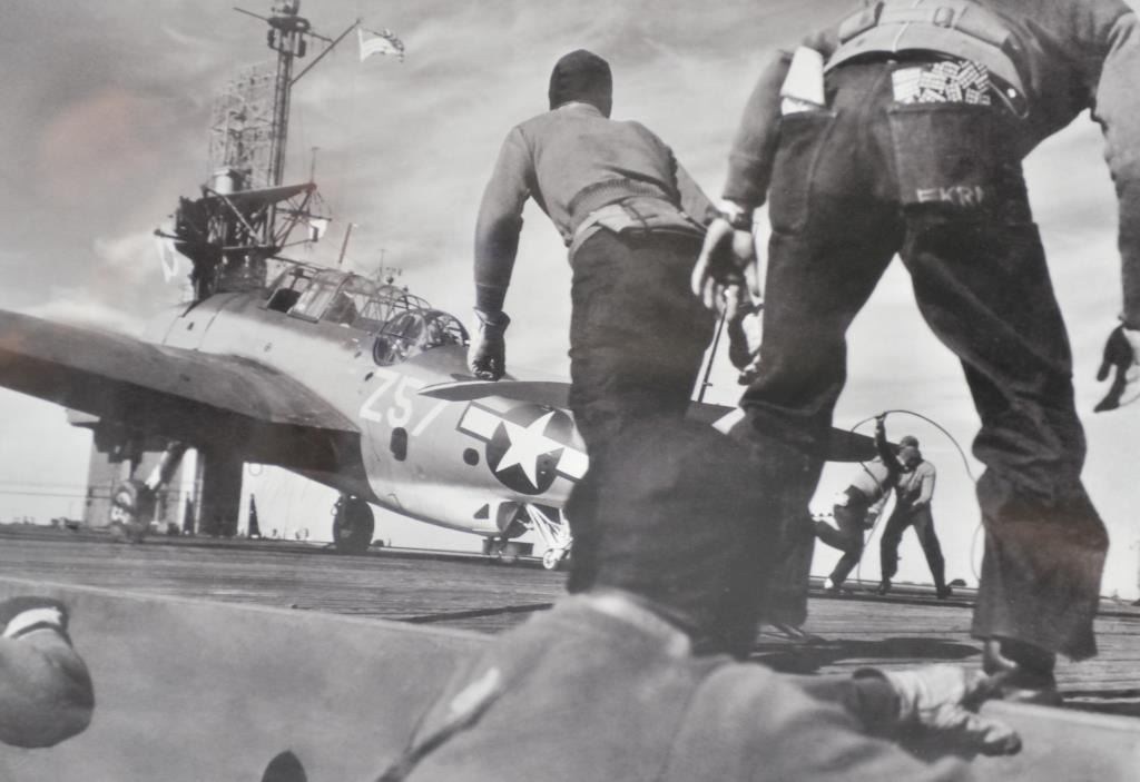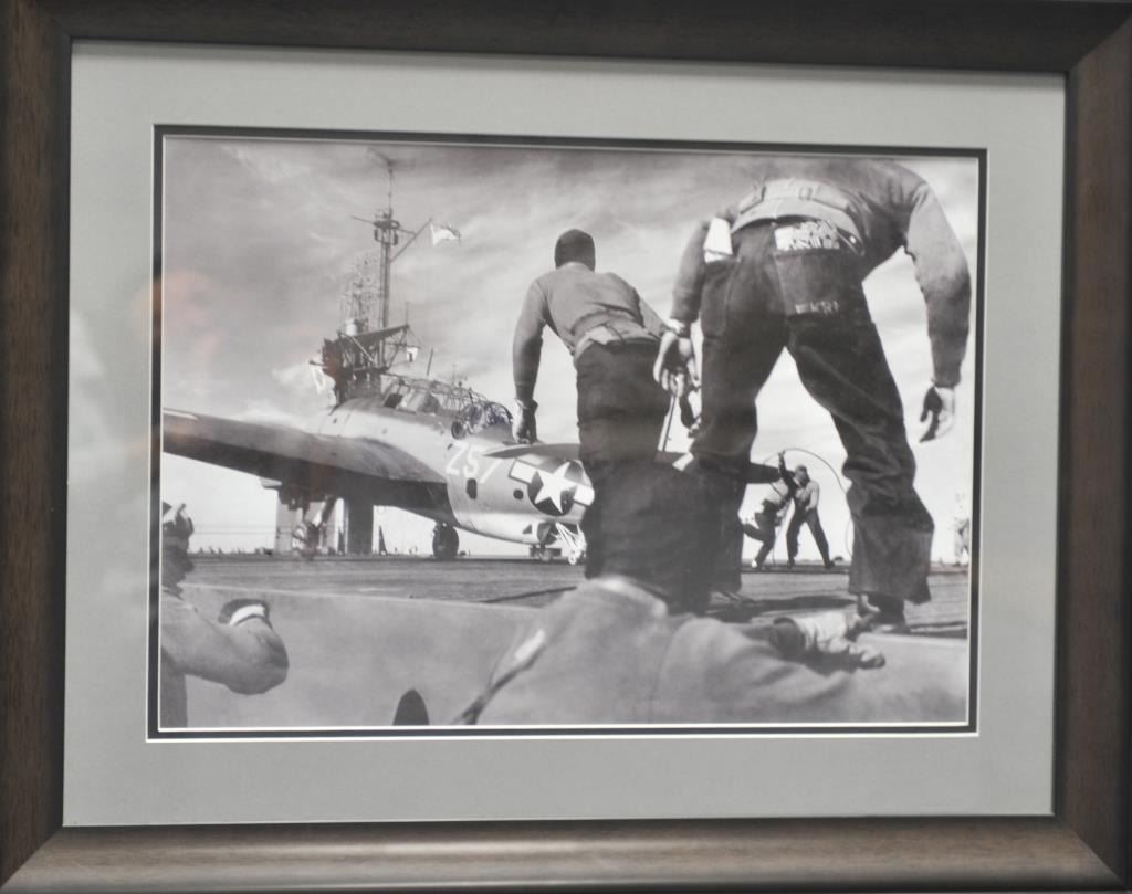 Lot 1810 Large framed and matted action scene on deck of a U.S. aircraft carrier with plane about to launch
