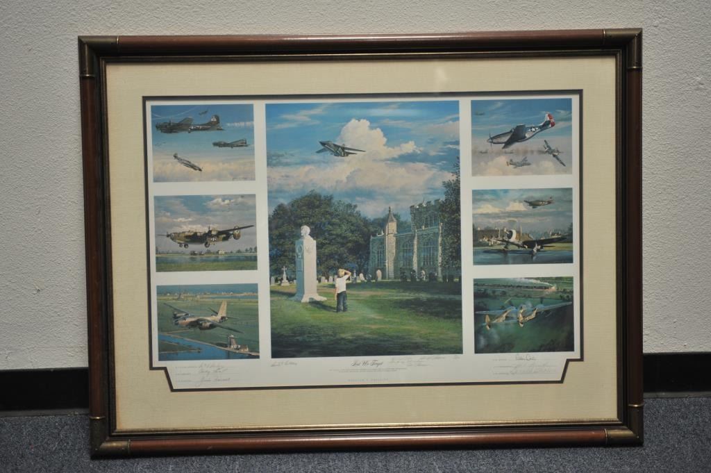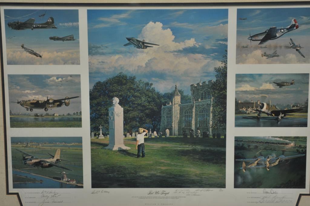 Large framed and matted print of World War II US Eighth Air Force aircraft. The piece, title, “Lest We Forget”, is a series of seven different individual depictions with an inscription from the artist. The aircraftshown include; the B-17, B-24 and B-26 bombers, signed by pilots of each aircraft. Additionally, the P-51, P-47 and P-38 fighter planes are depicted signed by pilots who flew these planes. The central print shows a young boy in an English churchyard watching a modern F-111 fighter jet flying low representing the contributions of the Eighth US Air Force in WWII. The print, from the Bill Bettis Nieuport 17 Restaurantcollection, is inscribed by the artist, Bill Phillips to Mr. Bettis and is also signed by General Curtis LeMay. Est.: $125-$250.