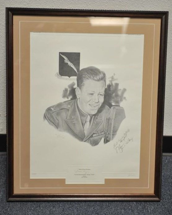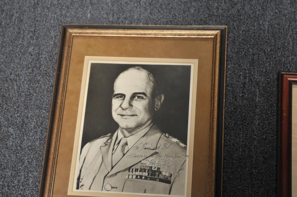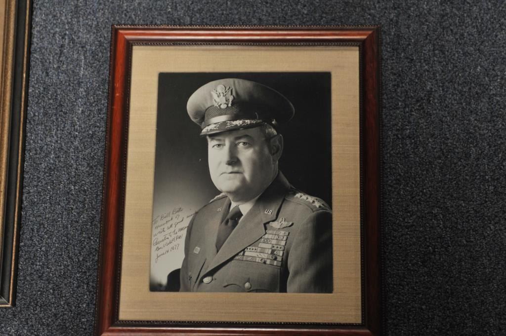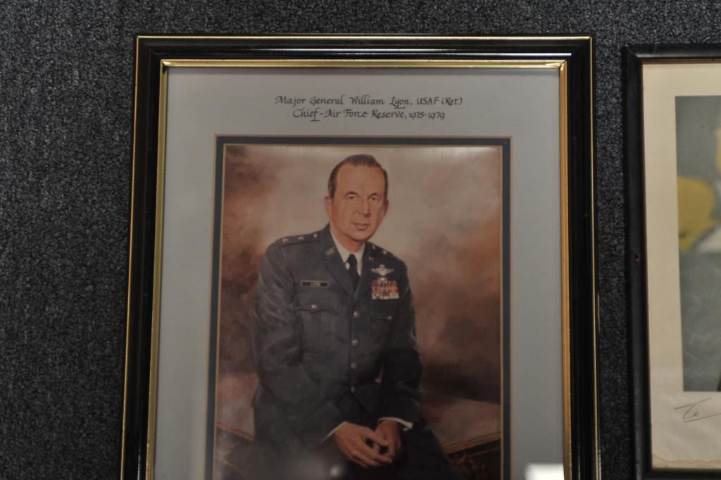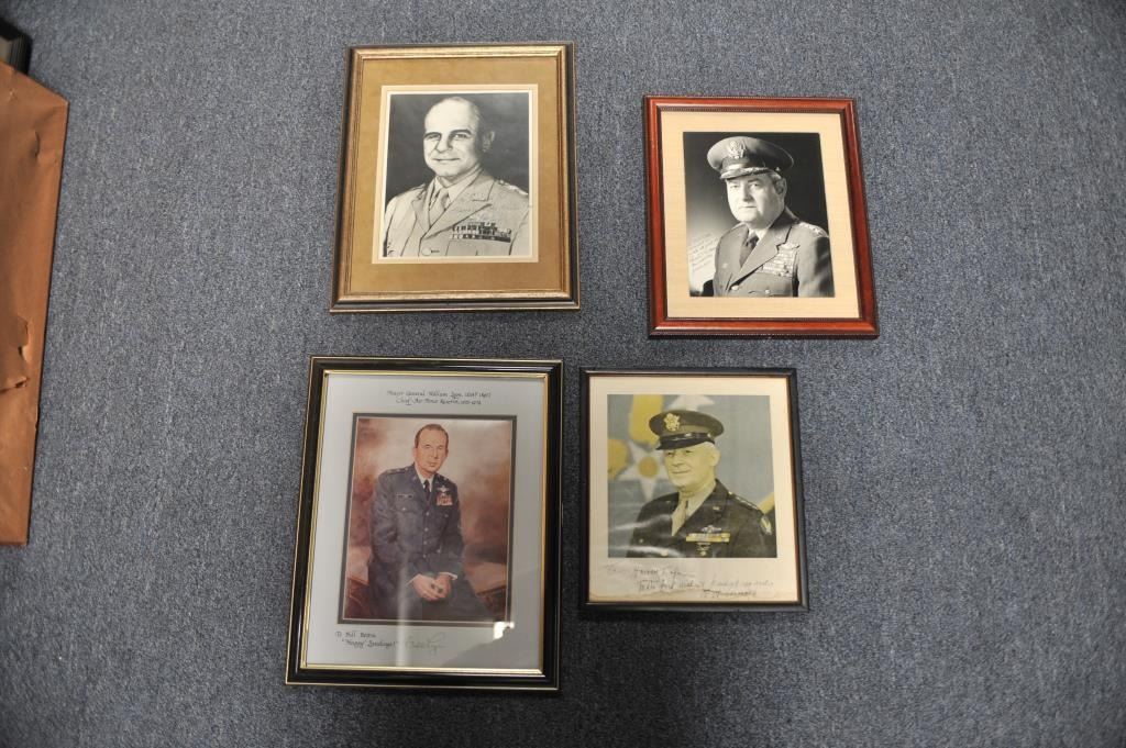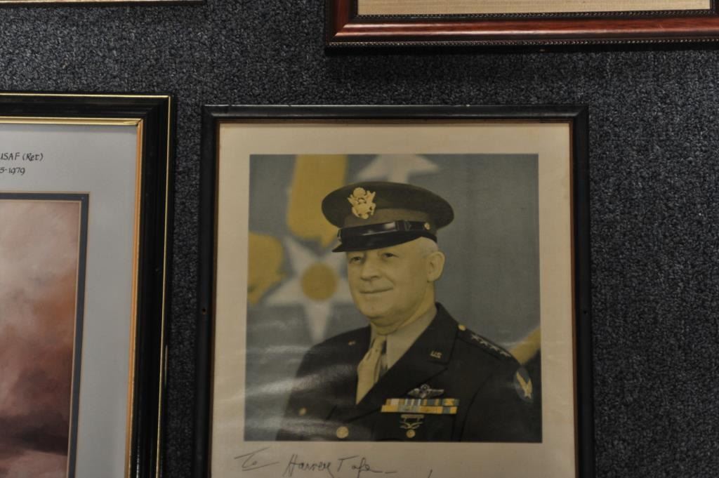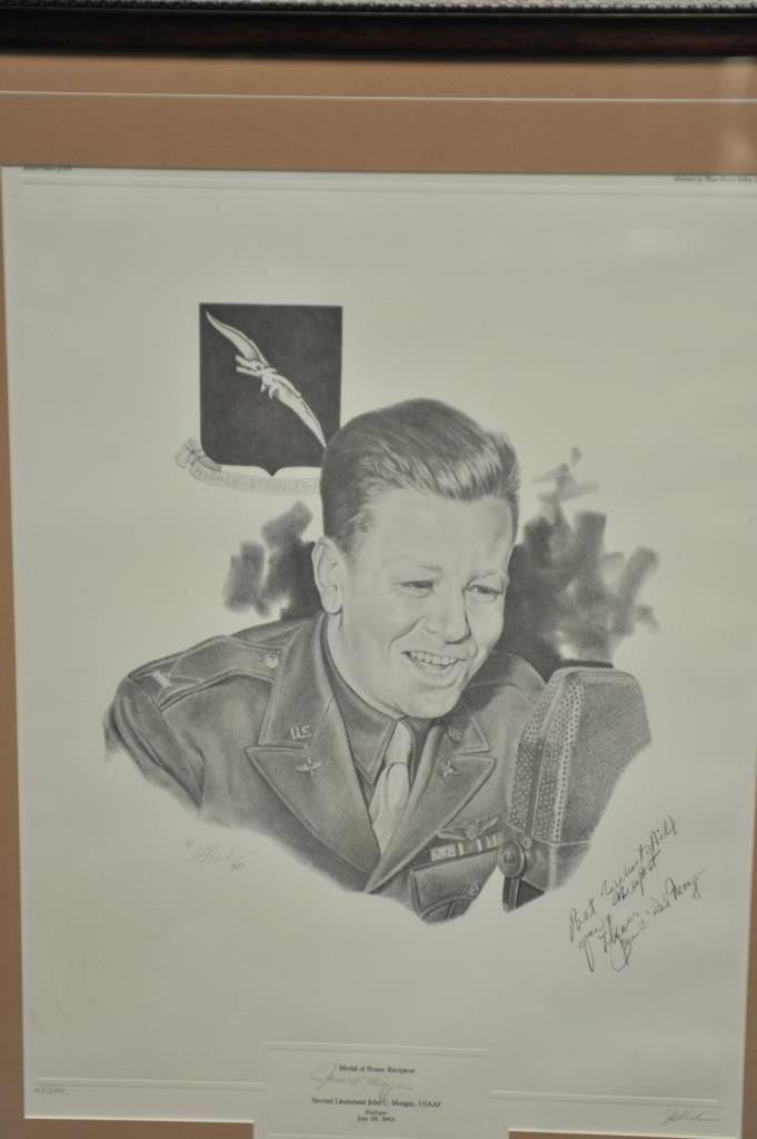 Lot of 5 framed U.S. military pieces including limited edition (500) print of Congressional Medal of Honor winner John C. Morgan, hand signed twice by Morgan, approximately 28” x 23” overall; three framed photos of U.S. Generals Jimmy Doolittle, Curtis LeMay and H. Arnold, all hand signed; also a color print, hand signed by Major General William Lyon. From the Bill Bettis Nieuport 17 Restaurant collection.Est.: $200-$400.