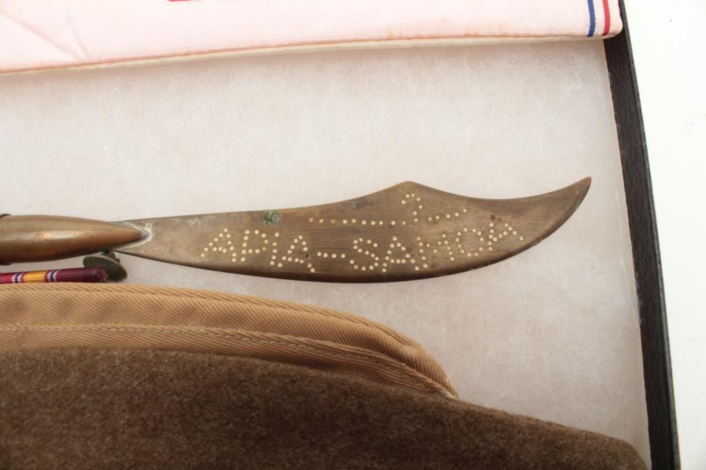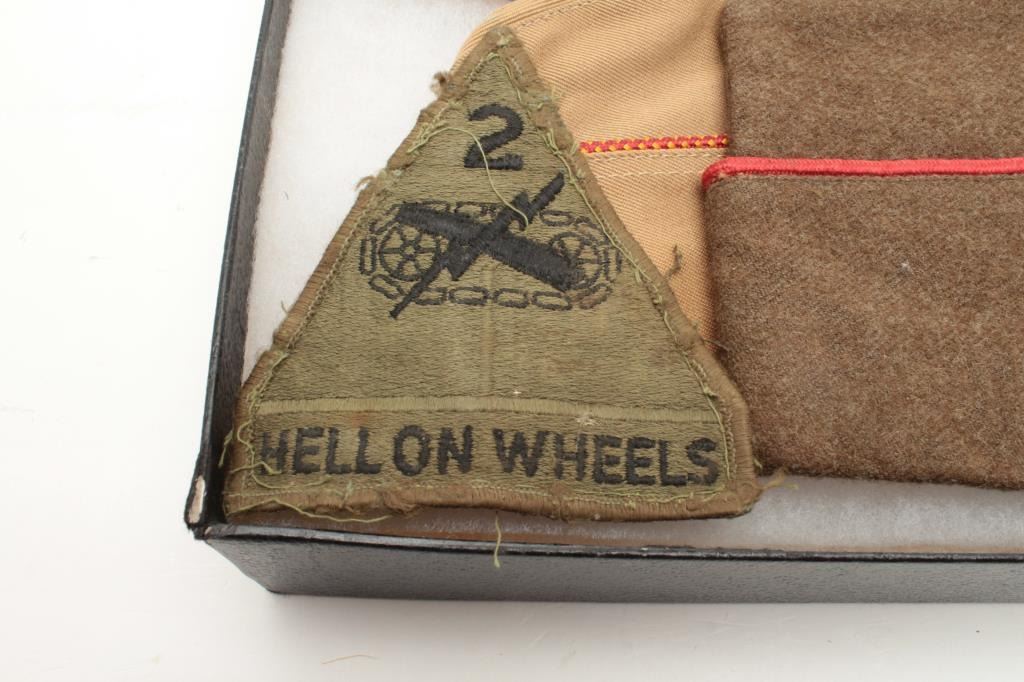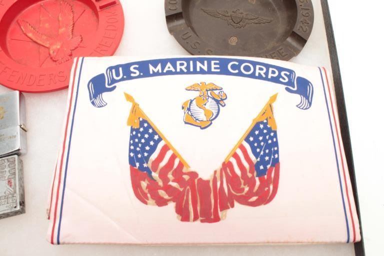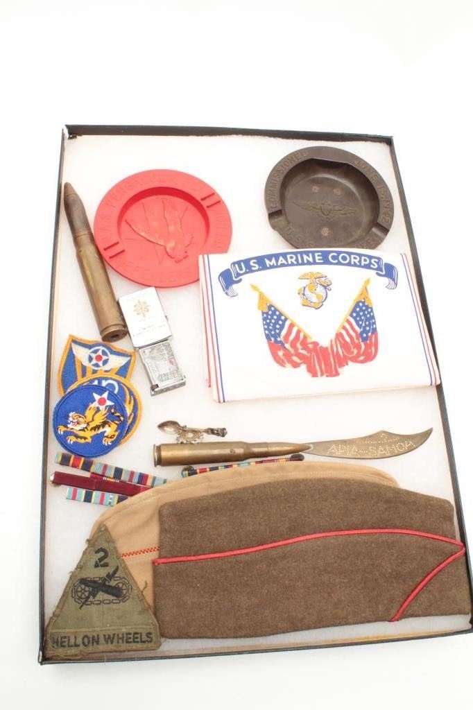 Large riker case of U.S. military items including soft caps, U.S.M.C. silk banner, ashtrays, cigarette lighter, shell art, patches and uniform decorations, etc. Est.: $100-$150.