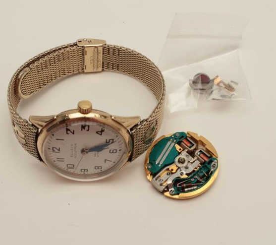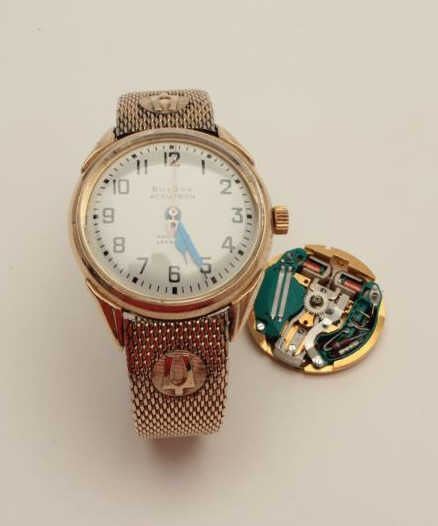 Vintage Bulova Accutron wristwatch; railroad approved, quartz movement; tuning fork band; original movement included which takes obsolete battery; movement changed to wear and use; running at time of description.Est.: $200-$400.