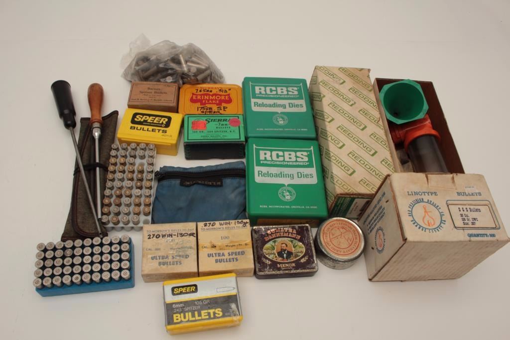 Lot of assorted reloading items as described: 1. Lyman powder measures 2. Redding powder scale & bullets 3. RCBS Dies for .300 Win. Mag and .30 carbine4. 250 .357 bullets 5. .270, 6mm and 7mm bullets 6. Misc. cases 7. Cleaning rods including a Swiss k31 folding rod.Est.: $150-$300