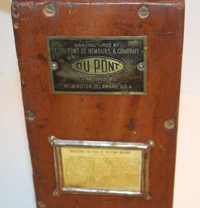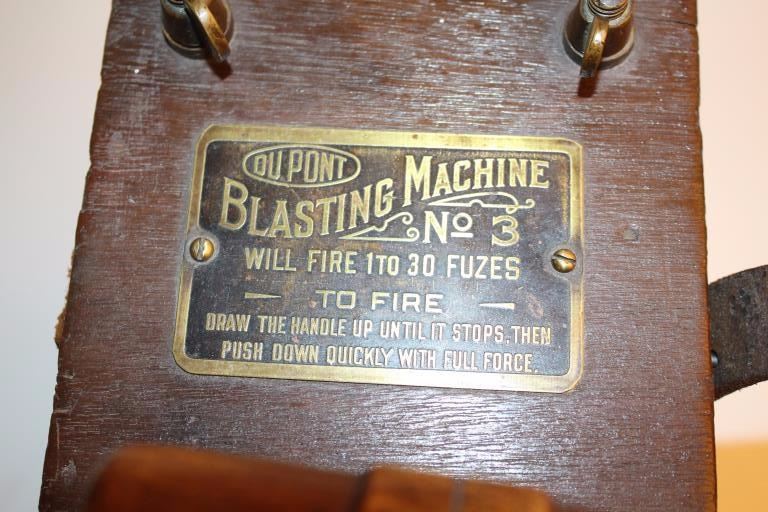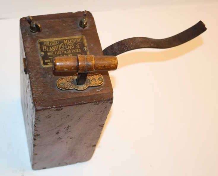 DuPont wooden “Blasting Machine No. 3”, approximately 17” in height including charging handle, 6” wide and 8” deep; leather carry strap broken. Est.: $200-$400.