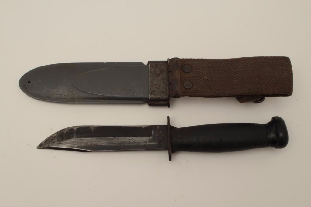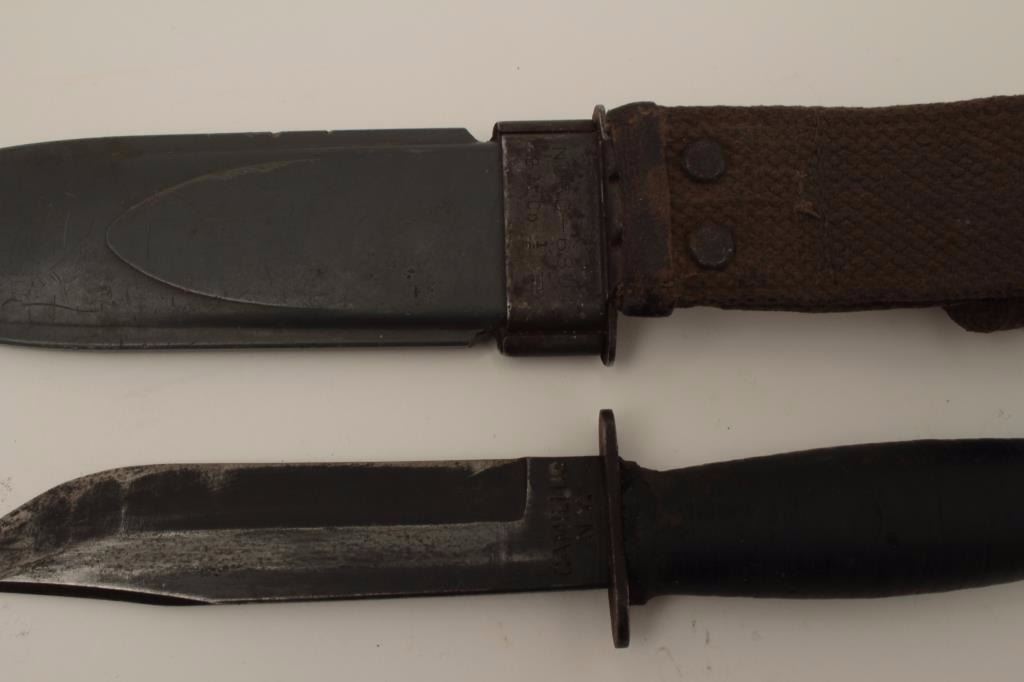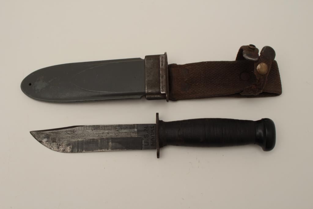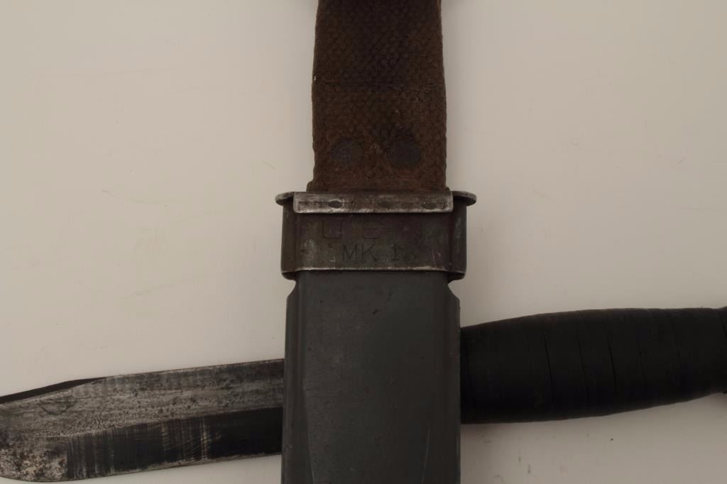 U.S.N. MKI U.S. issues knife by Camilus N.Y. from Vietnam era with fiber glass scabbard. Measures 11” overall with a 6” blade. Good to very good condition. Normal wear and use. Est.: $100-$200