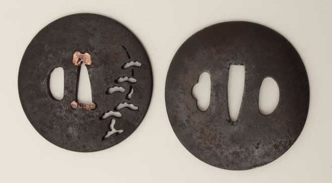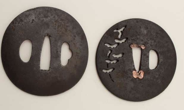 Two large iron tsuba. One pierced with cedar trees has remains of signature. The other finely forged with gold patina. 200-400 years old. EST:$200-$400