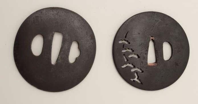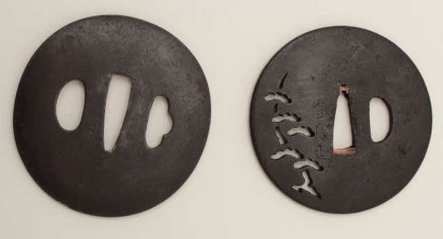 Lot 1853 Two large iron tsuba. One pierced with cedar trees has remains of signature. The other finely forg