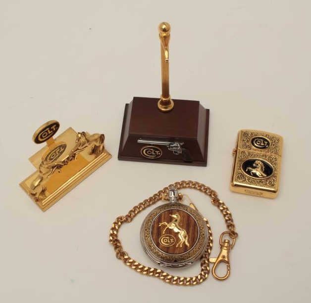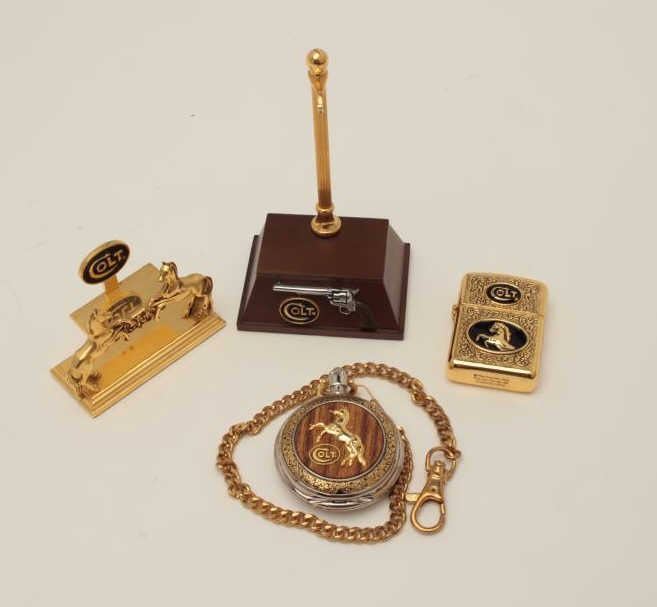 Colt Collectors’ Association memorabilia including a gold colored zippo style lighter with Colt Logo, an engraved case pocket watch with chain and Colt marked both on the watch and on a wood based stand; plus a goldcolored Rampant Colt designed business card holder for a desktop. Est.: $150-$300.