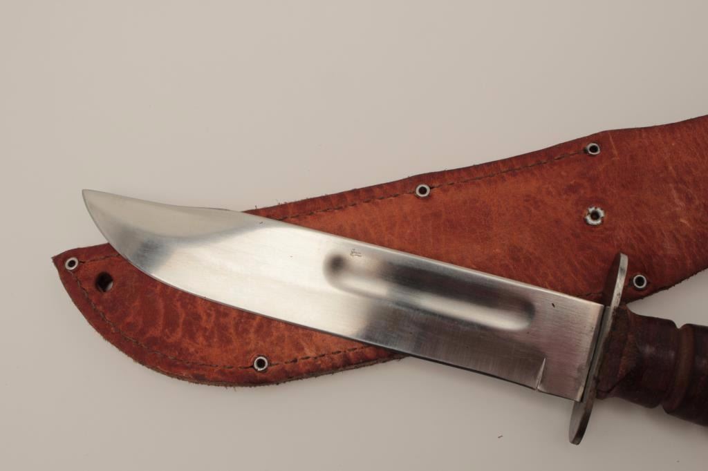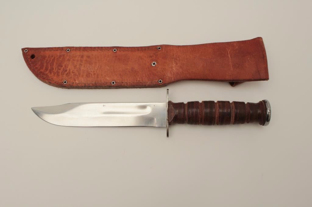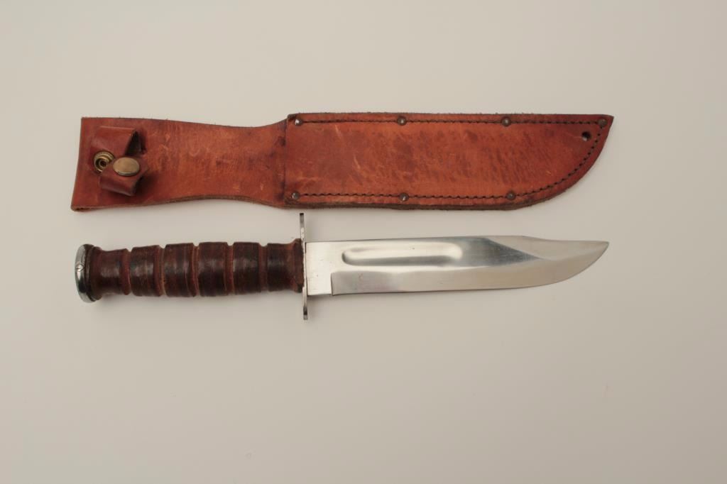 Lot 1858 Camillus U.S. issue knife (MK2) with scabbard. The blade has been re-polished and the grip is near