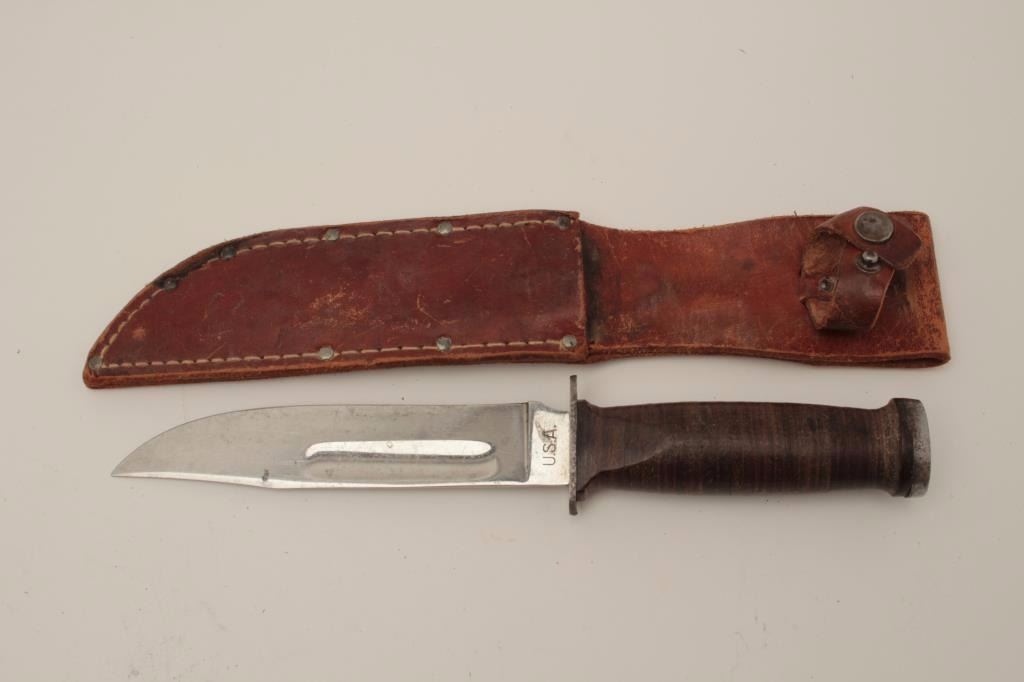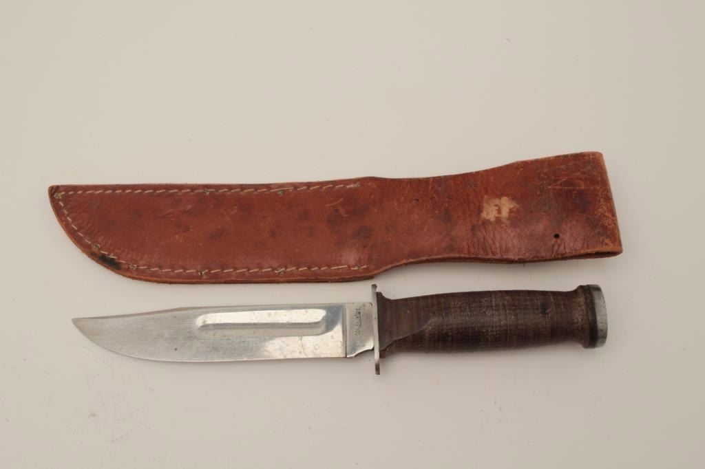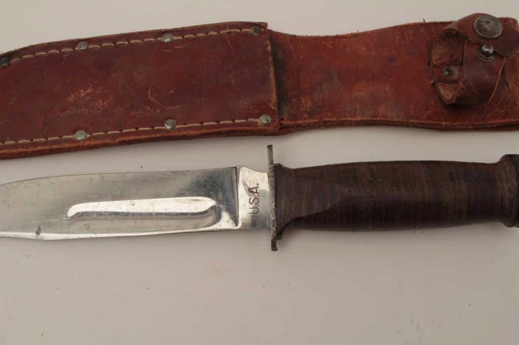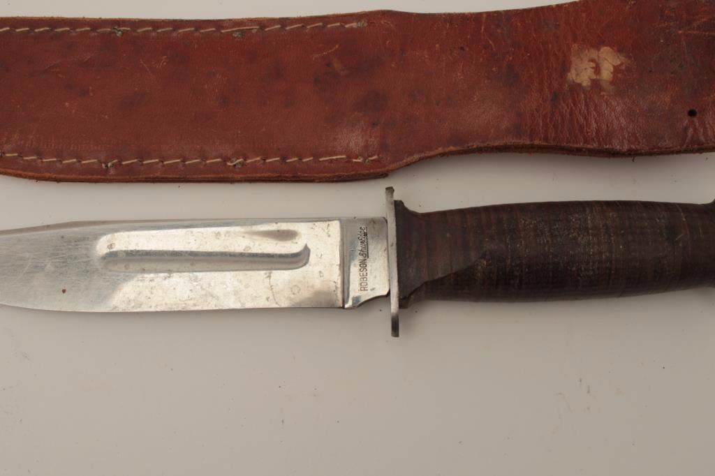 Robeson Shuredge marked U.S.A. military style knife with plated blade. Fine to almost excellent condition with minor spotting on the blade and slight scratches. Good to very good scabbard included. (Reference see ColePg. 69 #2) Est.: $100-$200