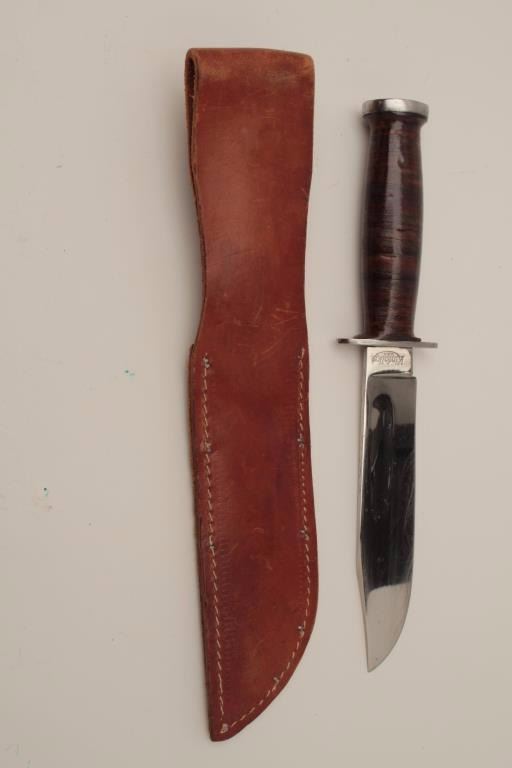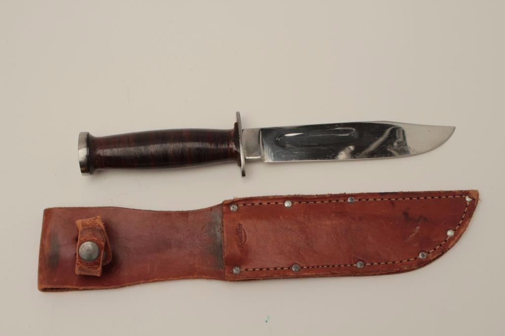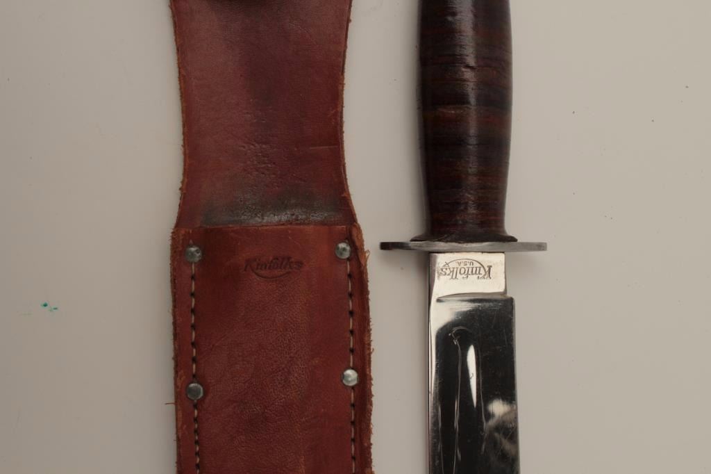 “Kinfolks” brand U.S. pattern fighting knife with scabbard and plated blade. In very good to almost fine condition. Measures 10 ½” overall with a 6” blade. WWII era private purchase. Est.: $200-$400