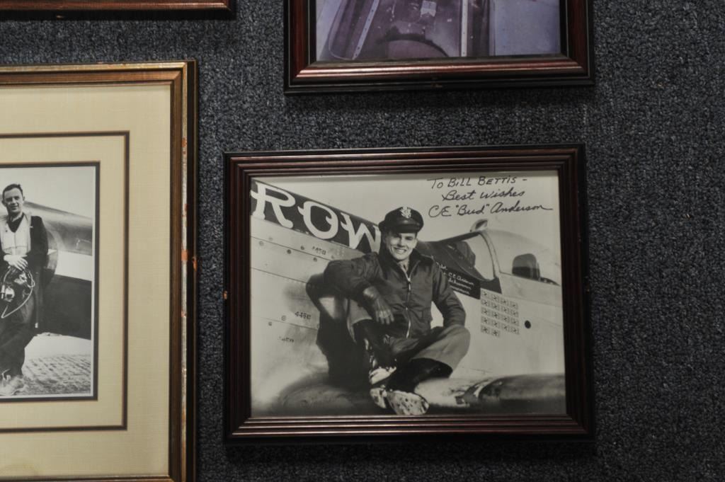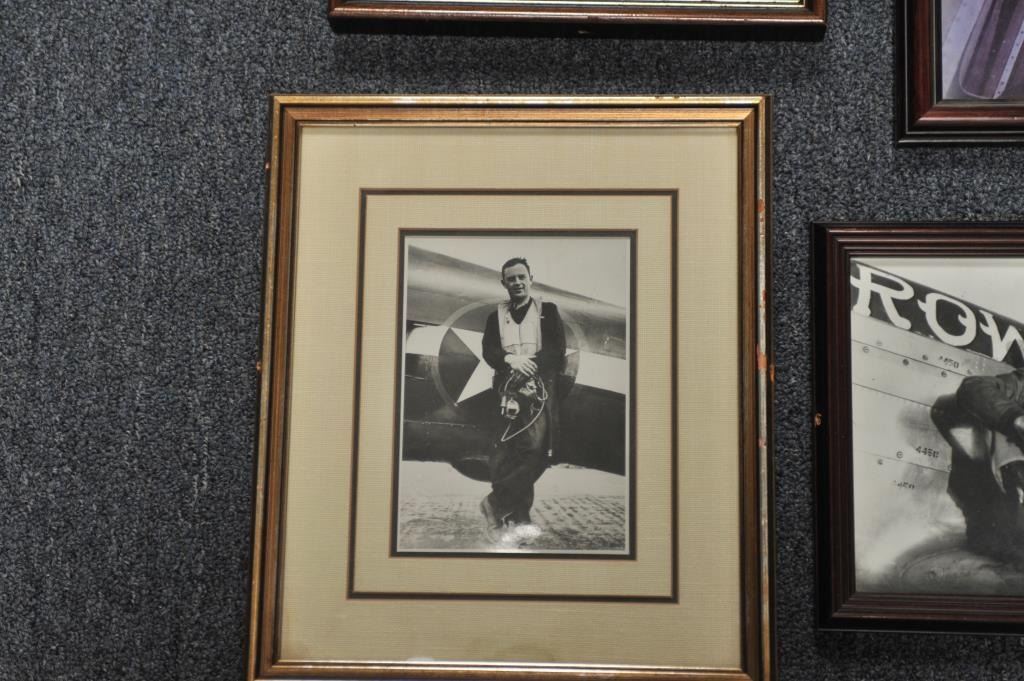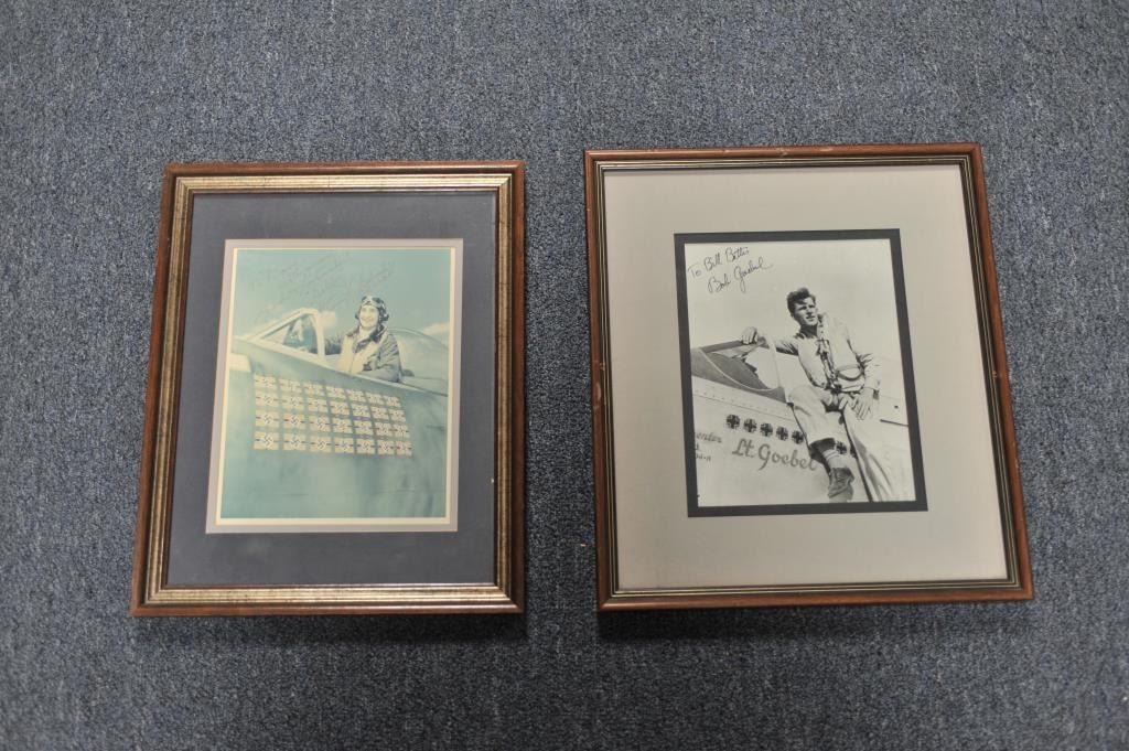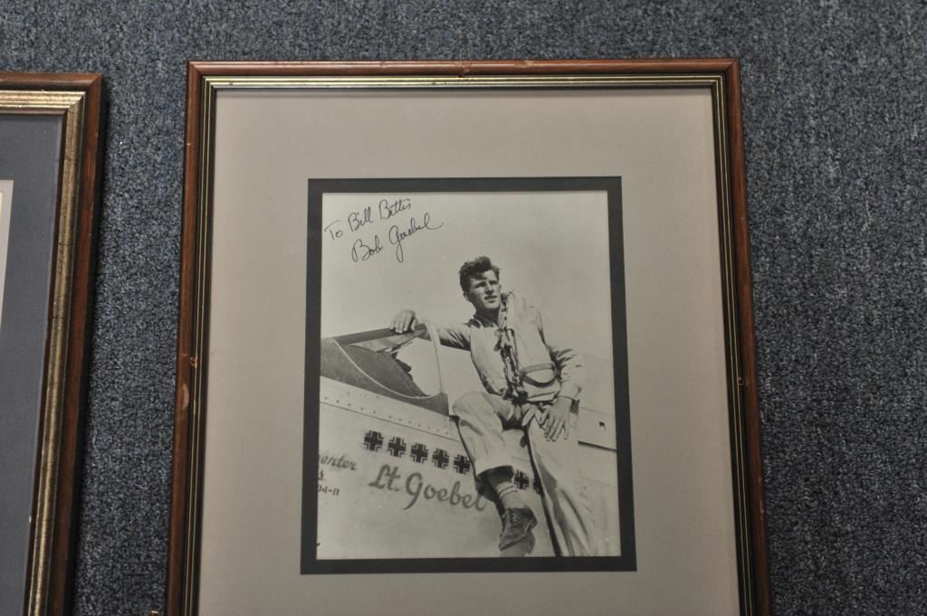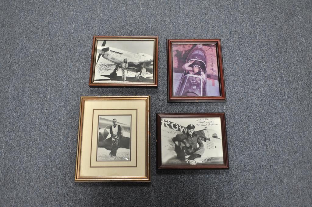 Lot of 8 framed photos of mostly WW II European Theater pilots and planes, signed by such airmen as Riece Blakeslee, Jim Brooks, C.E. “Bud” Anderson, Francis “Gabby” Gabreski (34.5 aircraft destroyed in combat; one ofonly 7 U.S. combat pilots to become an Ace in 2 Wars (WW II/Korea), Bob Goebel, Robin Olds (triple Ace; retired as Brig. General) and more! From the Bill Bettis Nieuport 17 Restaurant collection. Est.: $200-$400.