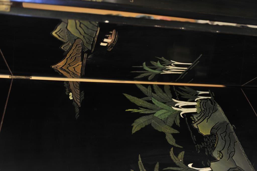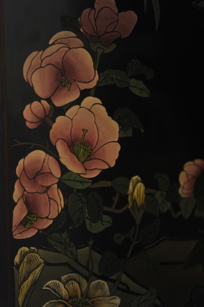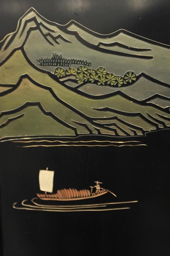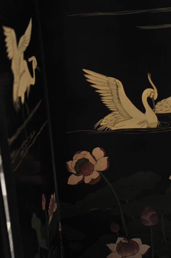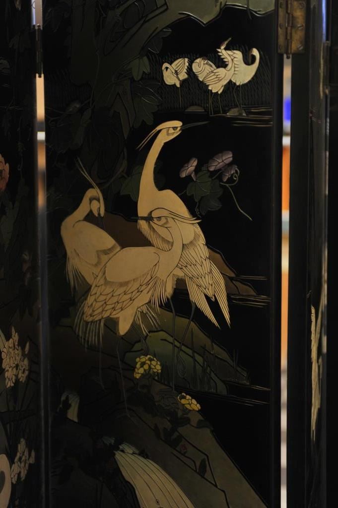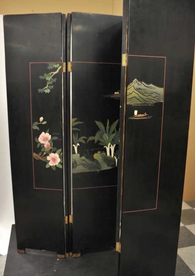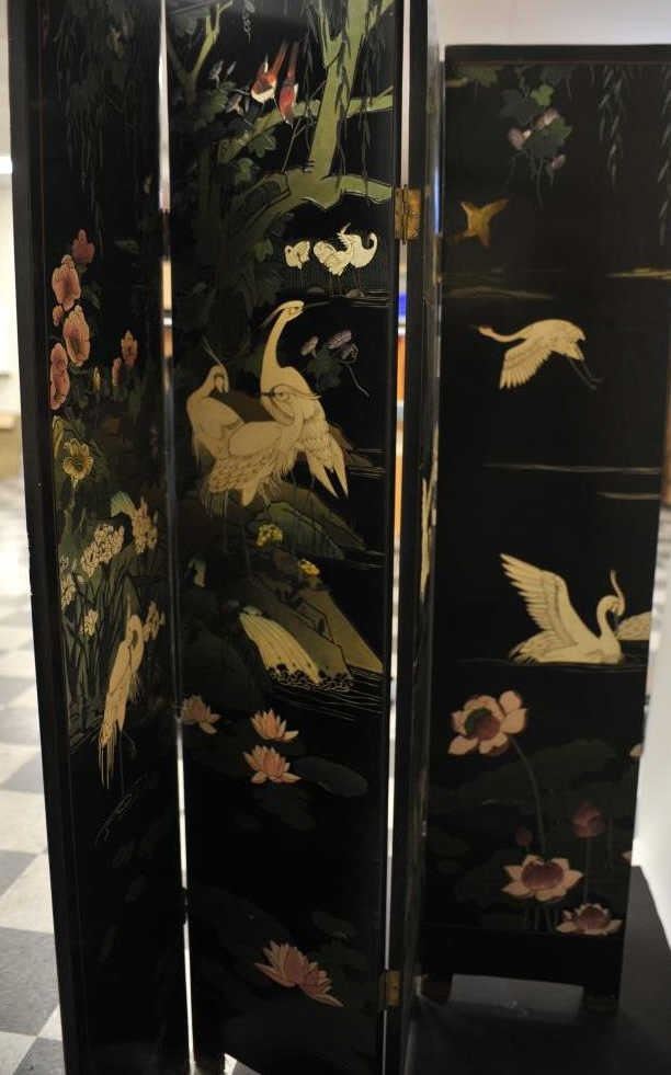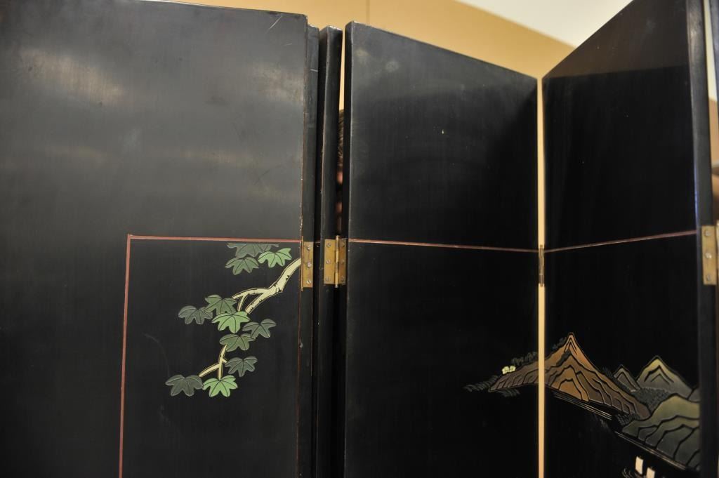 Fancy inlaid Japanese 6 panel folding wood and lacquer screen, each panel approximately 72” in height and 16” wide (6 feet tall and 8 feet wide when opened). From the Bill Bettis Nieuport 17 Restaurant collection.Est.: $300-$600.
