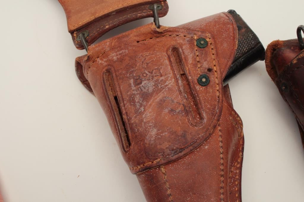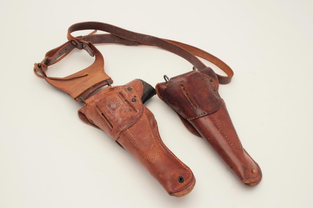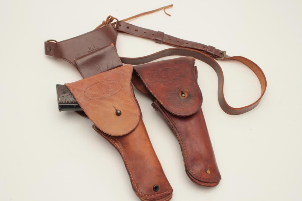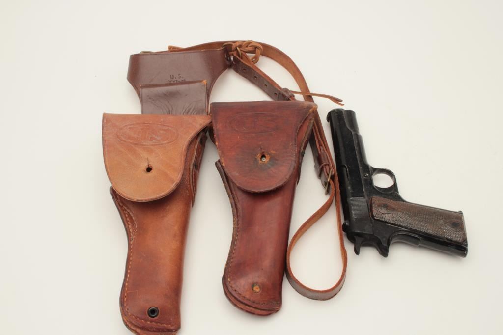 Lot of 2 leather U.S. flap holsters for Model 1911 pistol, one with shoulder straps and non-firing 1911 holster “filler” non-gun. Est.: $100-$200.