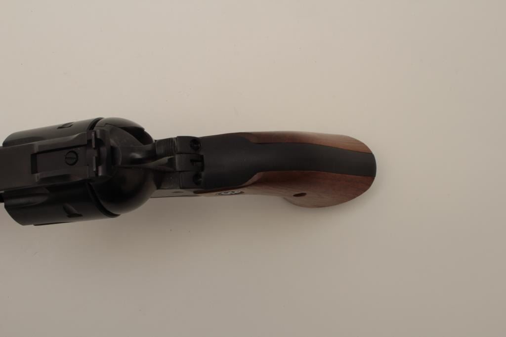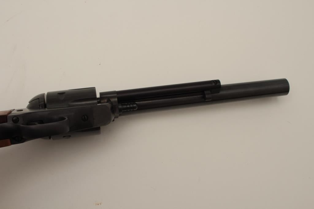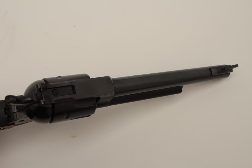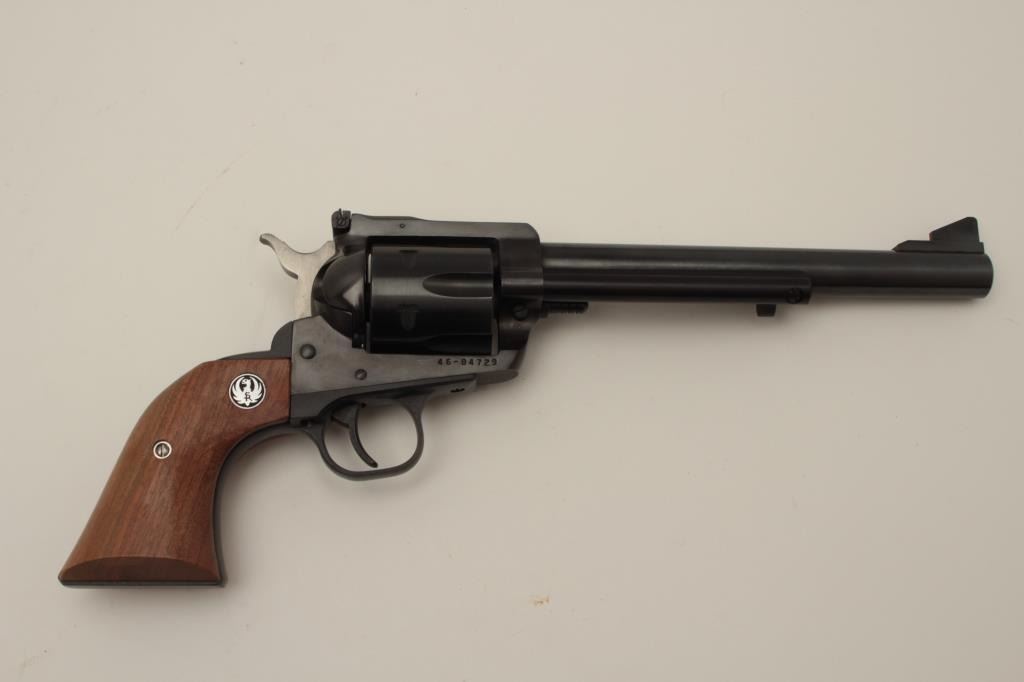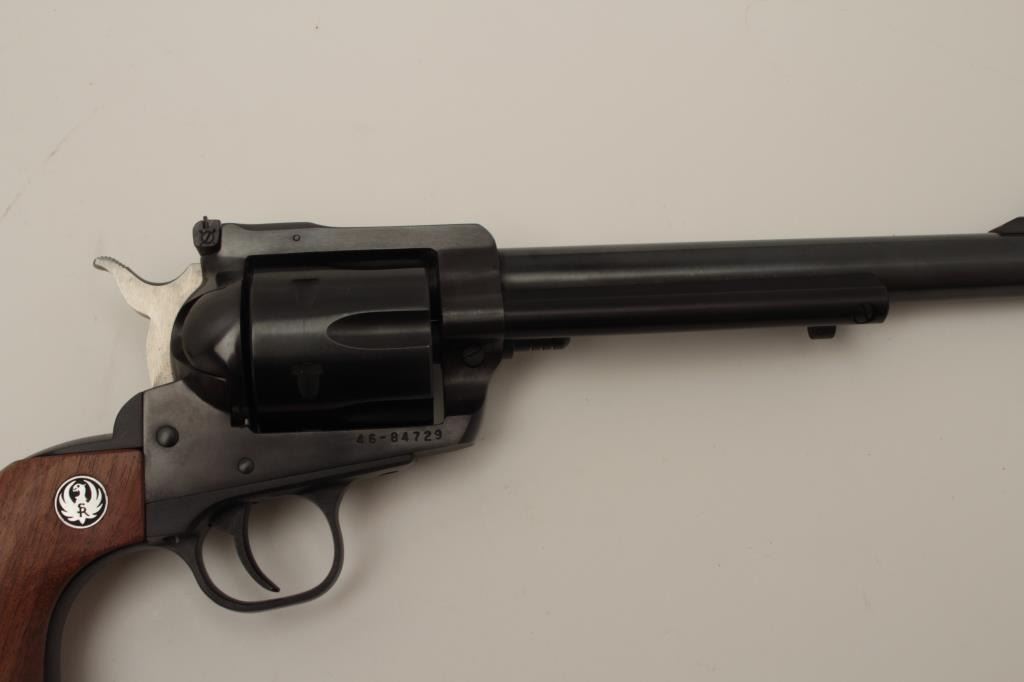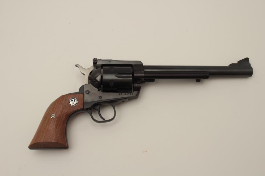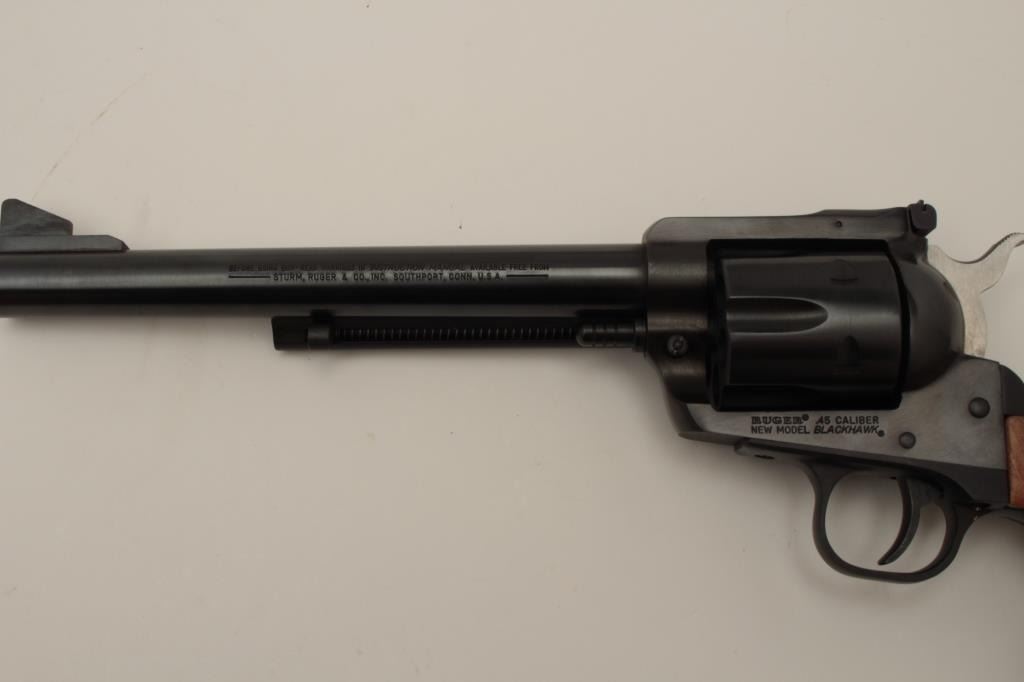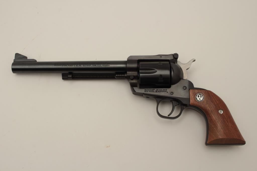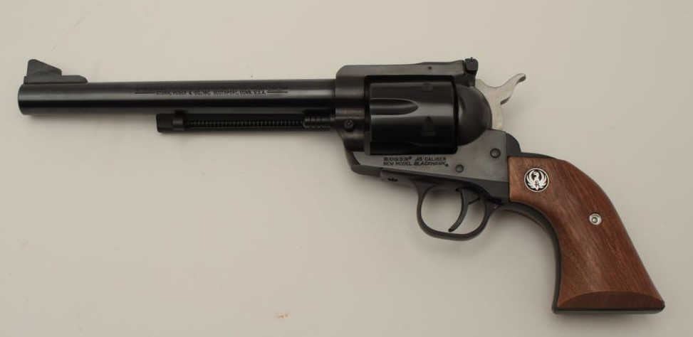 Ruger Blackhawk single action revolver in .45 L.C. caliber with an extra .45ACP cylinder, S/N 45-84729 showing a 7 ½” barrel and wood grips. Fine to excellent condition showing 98%-99$ finish with slight use only.(Modern/PPT) Est.: $300-$600
