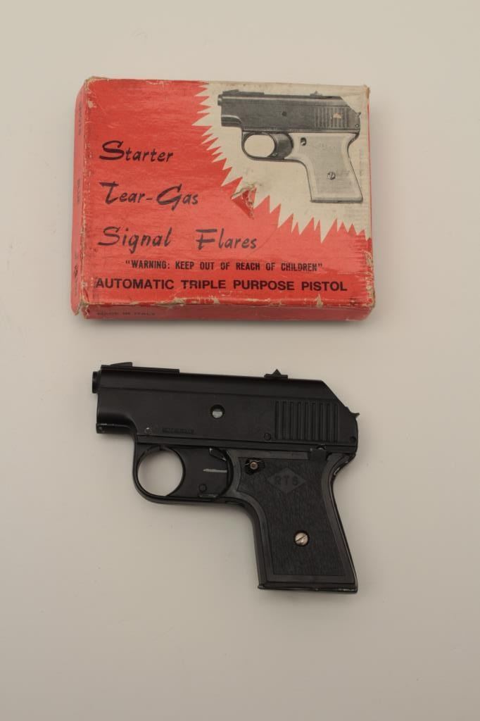 Starter/ Flare semi-auto pistol, marked, “Automatic Triple Purpose Pistol”. The Italian made pistol is in good overall condition with a painted black finish showing some flaking. The plastic grips are in good condition. The pistol is in the original box, which shows wear with two of the corners broken. (Modern) Est.: $50-$100.