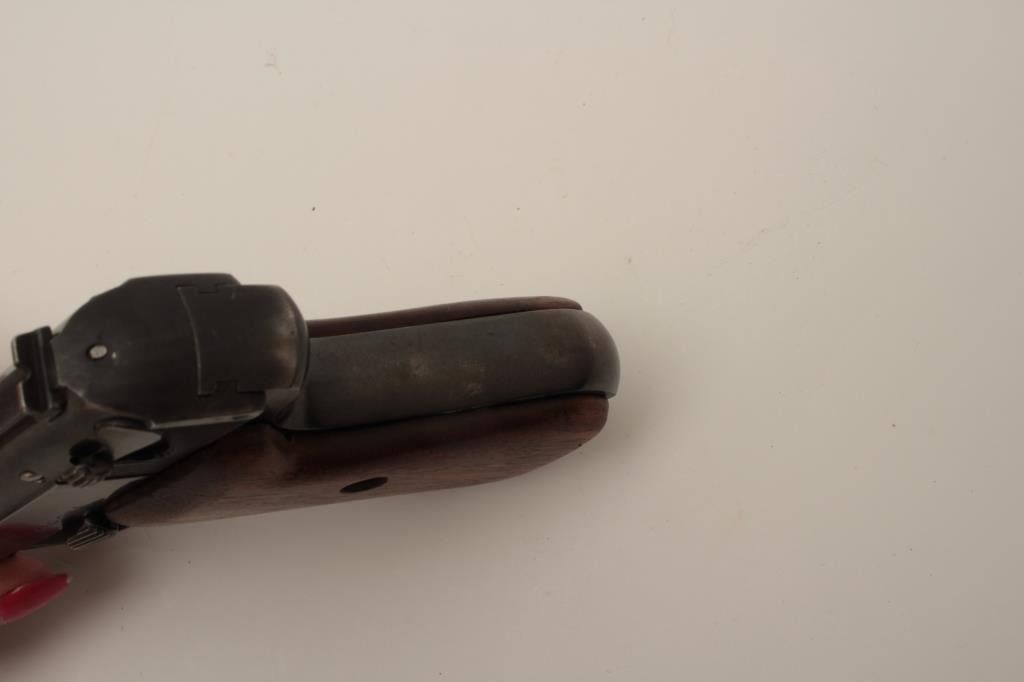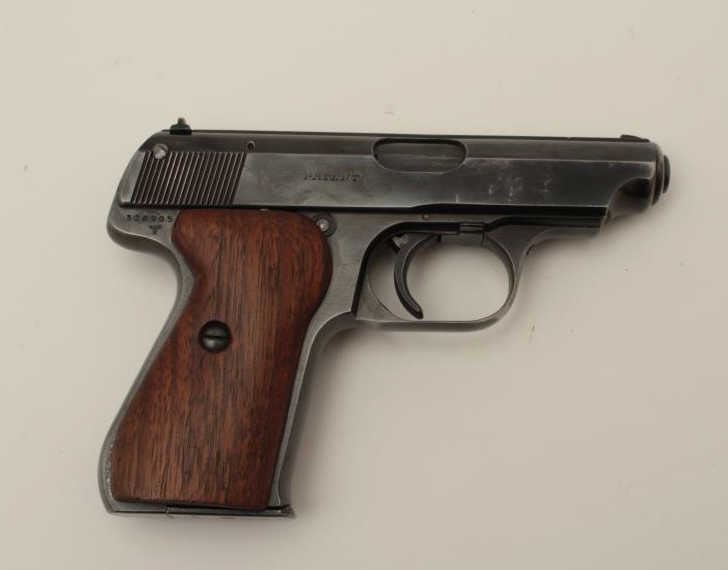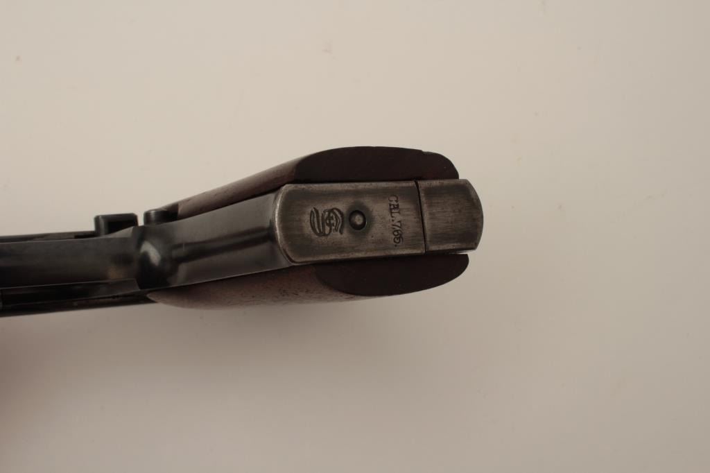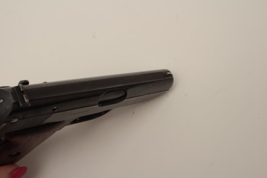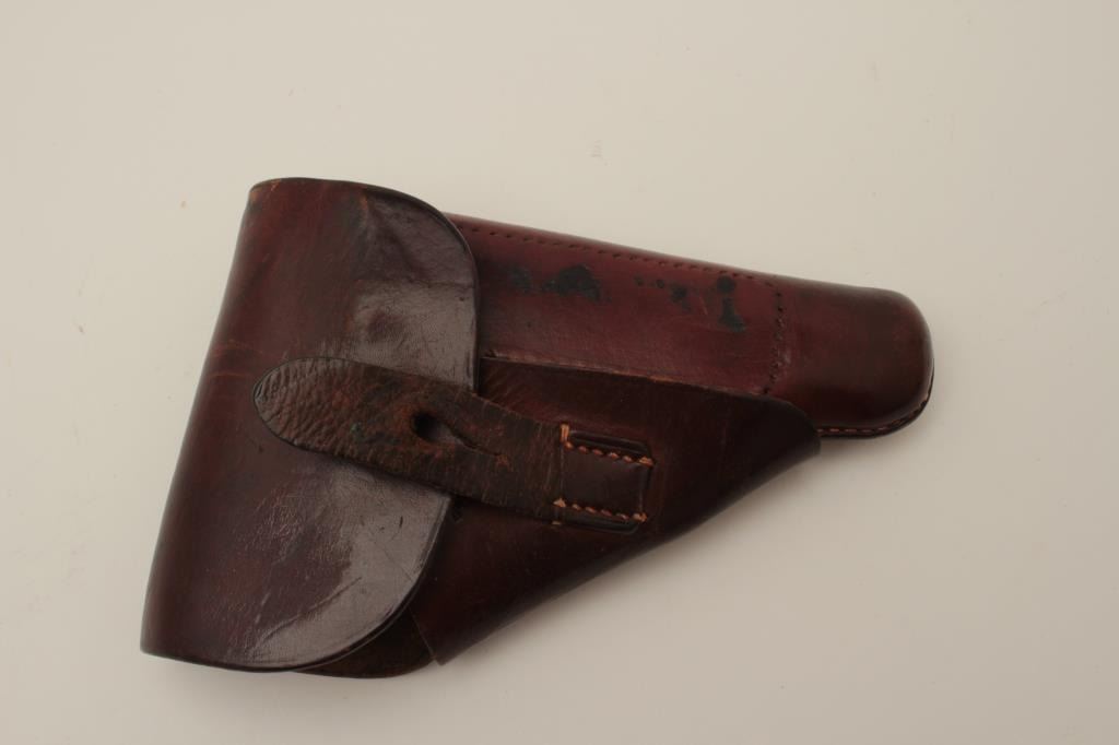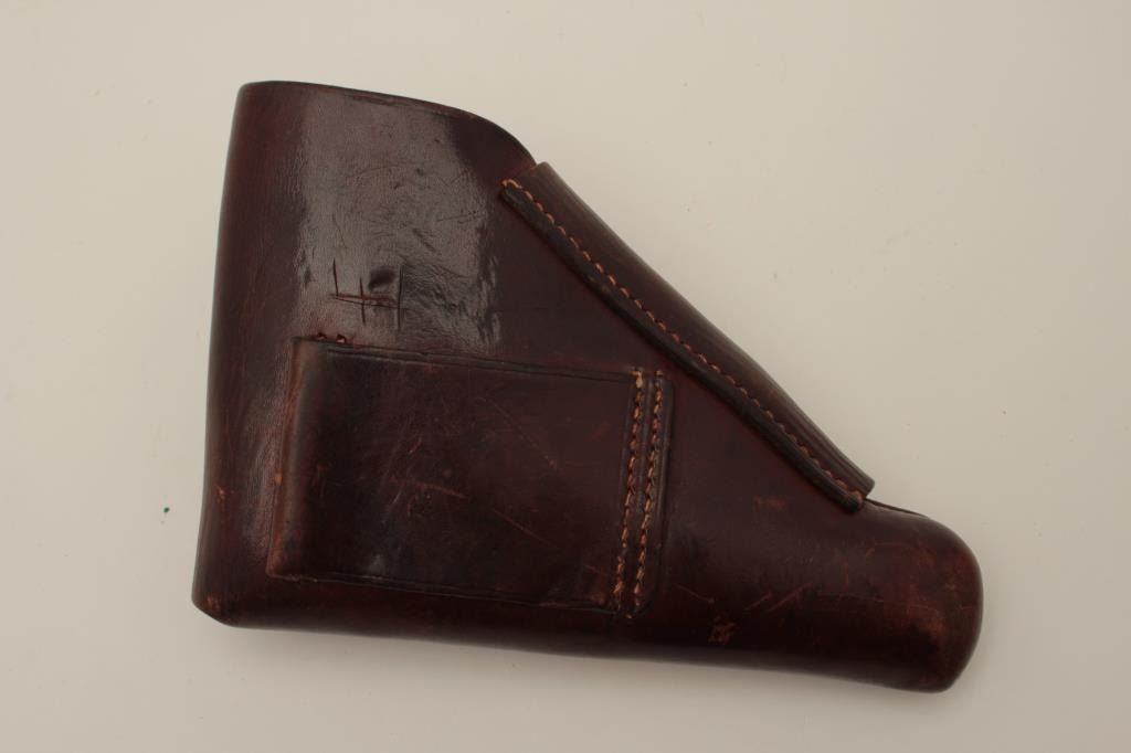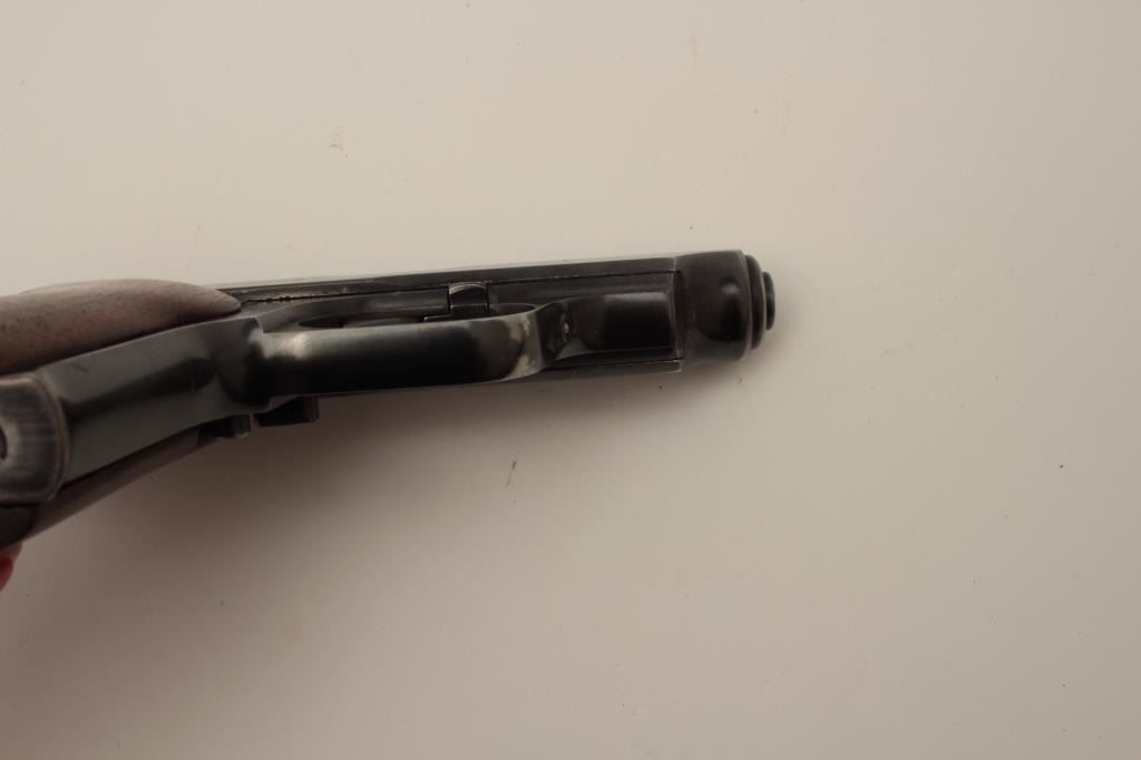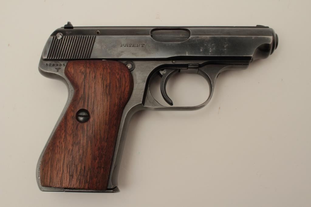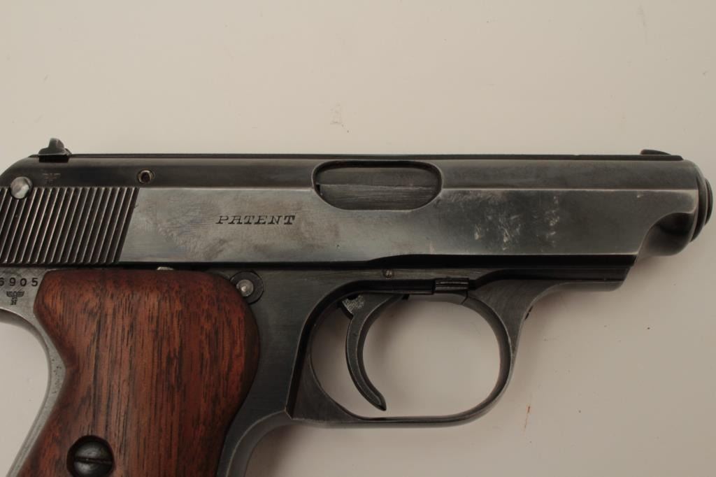 J.P. Sauer Nazi marked Double Action .32 ACP caliber semi-auto pistol with holster, S/N 326905 showing Waffen 37 and eagle N proof. 85%-95% commercial quality original blue finish in very good condition overall. Goodmarkings and good bore with Sauer marked clip. The grips are old wood replacements. Akah marked WWII period German officer’s style holster for this pistol included. (C&R/PPT) Est.: $350-$700