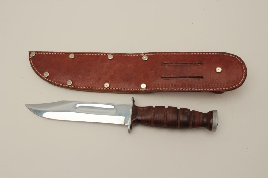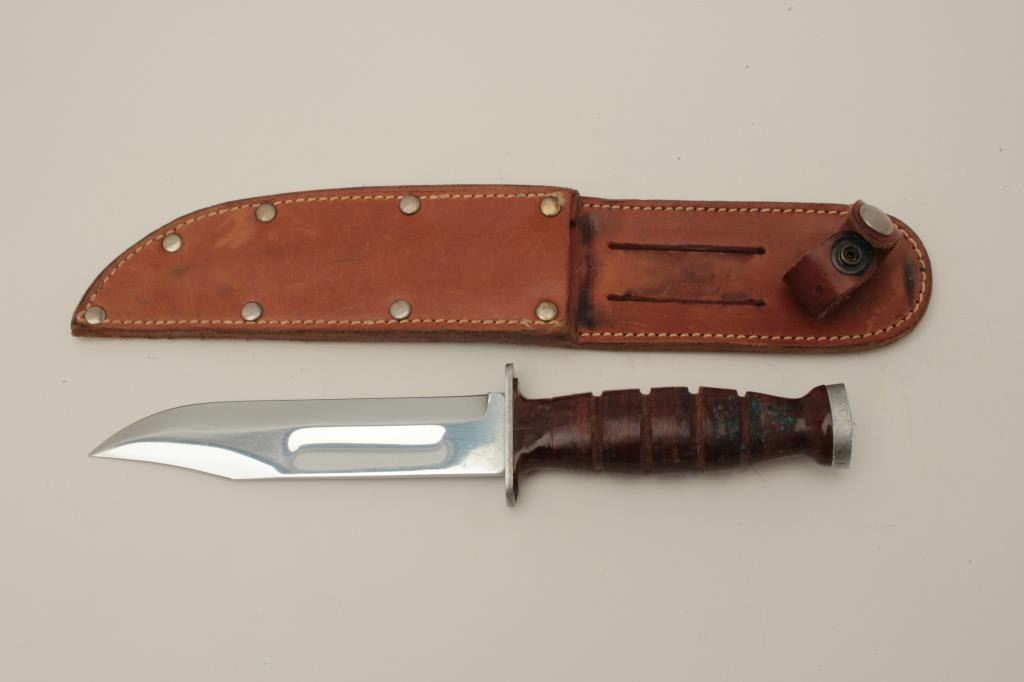 Kabar Olean, N.Y. U.S. issue knife with 6” plated blade. Excellent to almost mint, Pre MKI. (Cole/Silvey P.91 references). Brown plastic top and bottom to grip. Est.: $200-$400