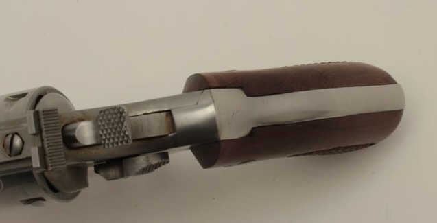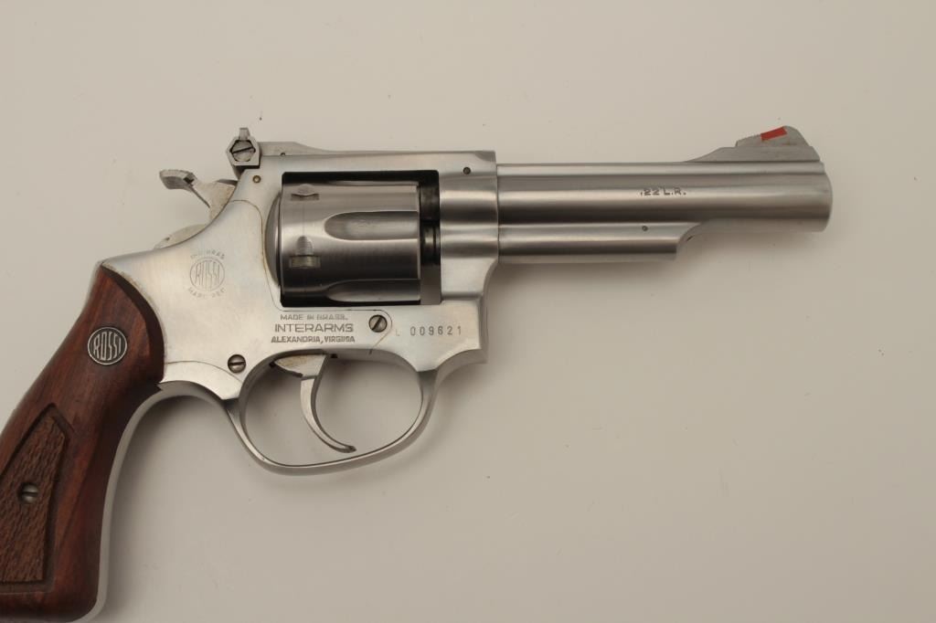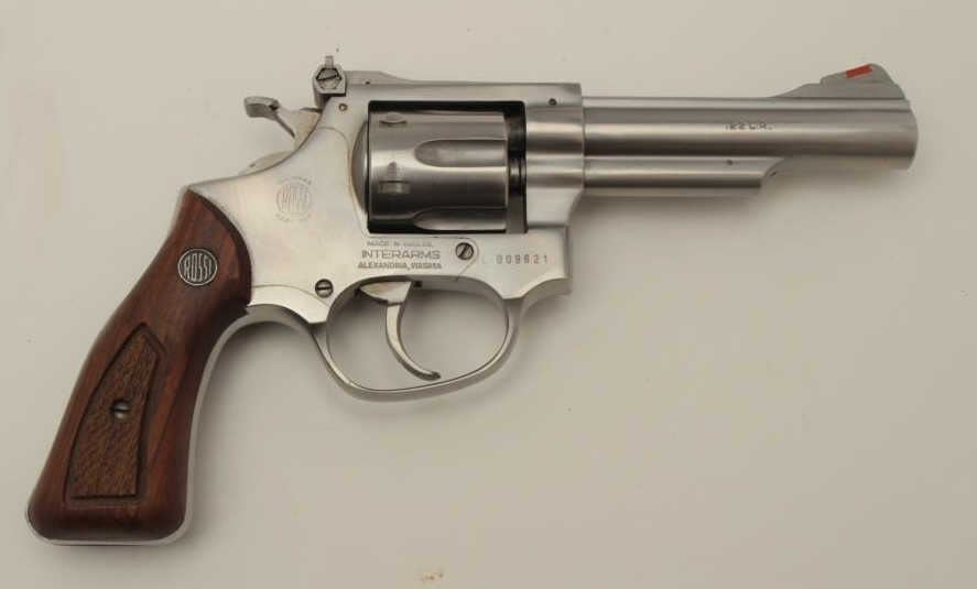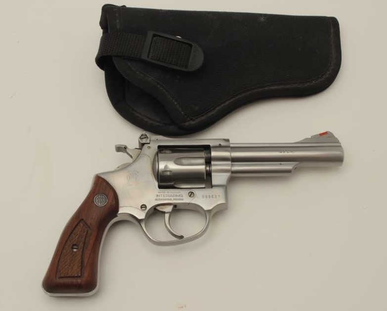 Rossi .22 caliber double action stainless steel “Kit Gun” inspired revolver with target sights, S/N L009621 showing 4” barrel, wood grips and fabric holster. Fine used condition. (Modern/PPT) Est.: $150-$300