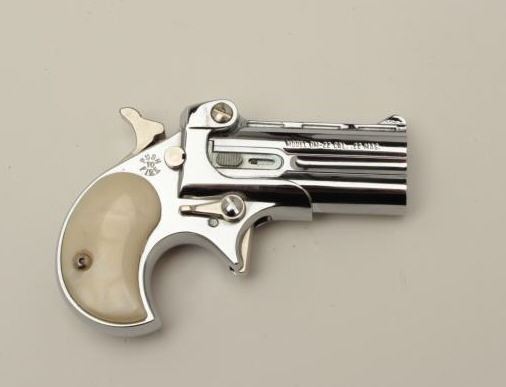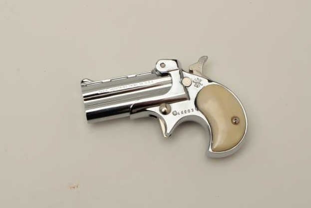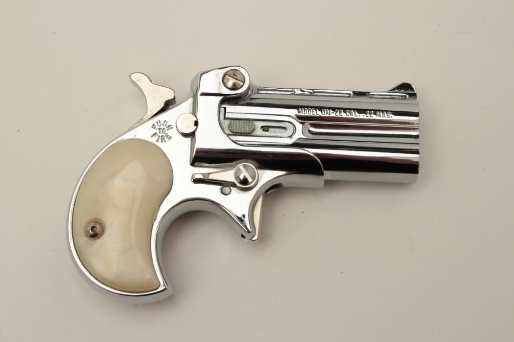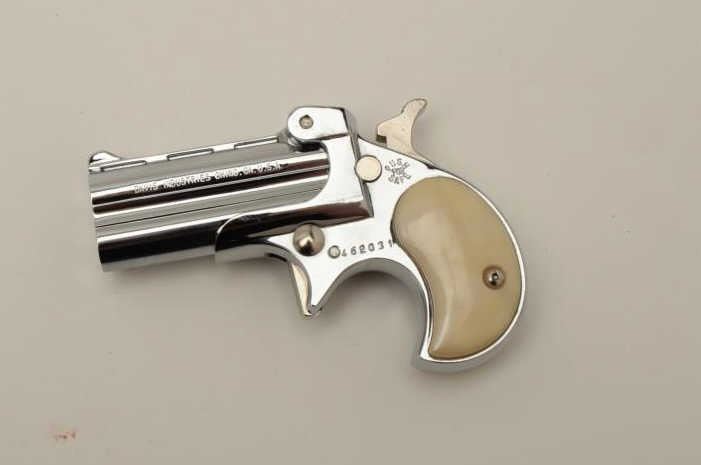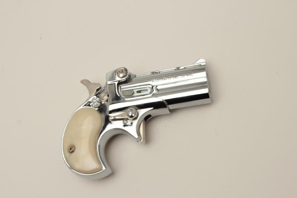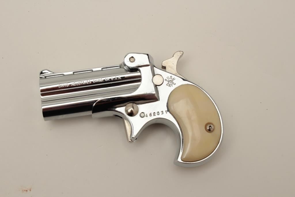 Davis Industries .22 mag- .22 L.R. over under derringers with 2” barrels and 4” overall. Nickel plated with simulated ivory grips. Fabric holster included. Fine to excellent used condition. (Modern/PPT) Est.: $150-$300