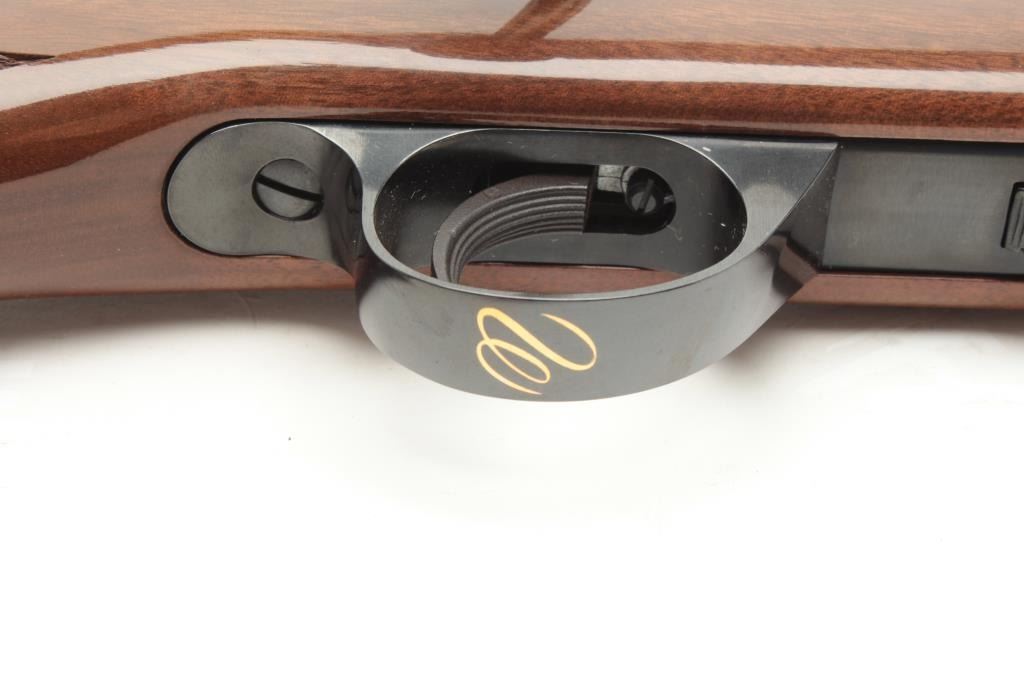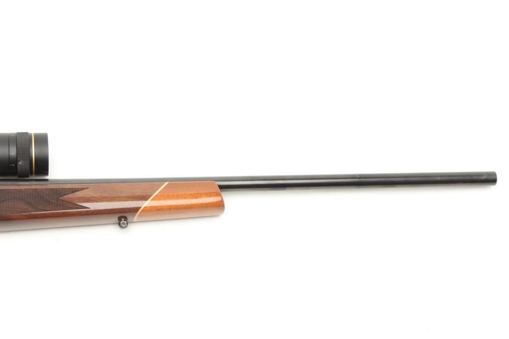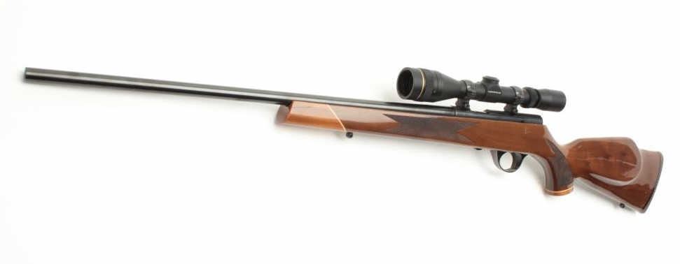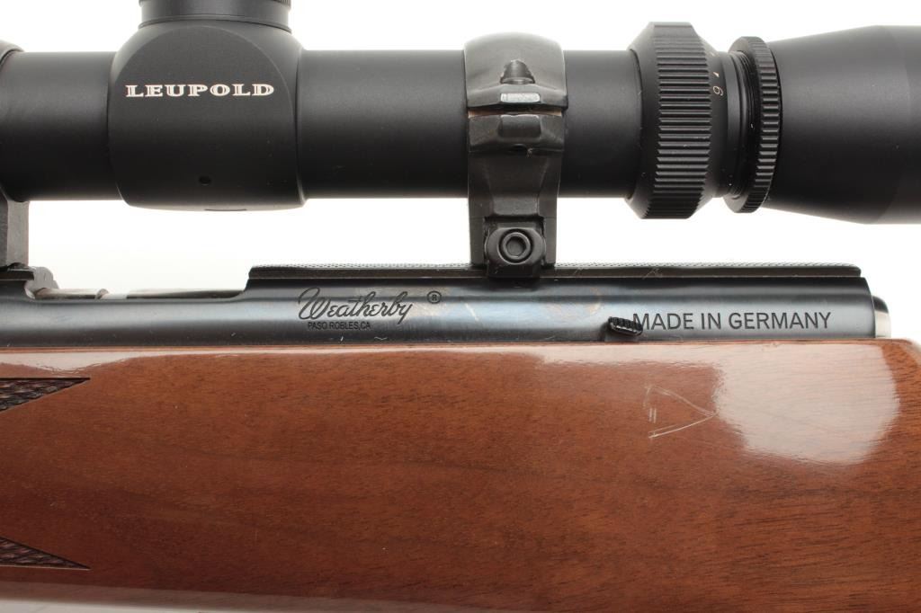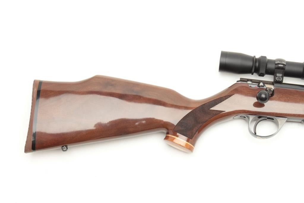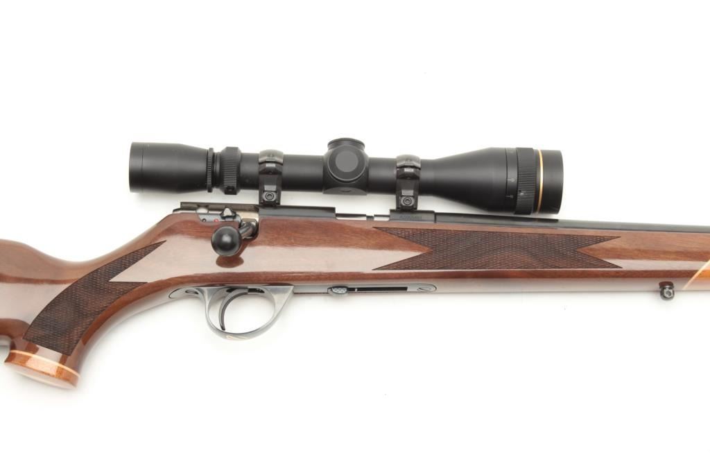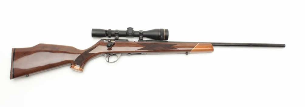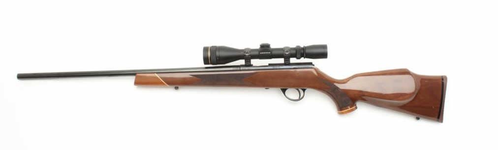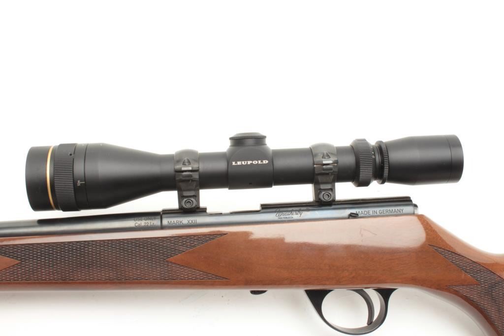 Weatherby MK. XXII bolt action rifle, .22 Long Rifle caliber, serial #AS005401. The rifle is in very good overall condition with a 23” barrel. The barrel and receiver retain the majority of their blued finish with only a couple small marks on the barrel. The checkered wood stock is in very good condition with small mars and exotic wood fore end and pistol grip. The butt stock ends with a Weatherby marked rubber recoilpad. The rifle is topped with a Leupold Vari-X II 3 x 9 variable power scope. The bore is good, the action crisp and markings are sharp on this Weatherby marked made in Germany. No magazine. (Modern) Est.:$400-$800.