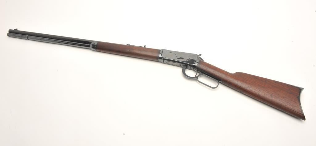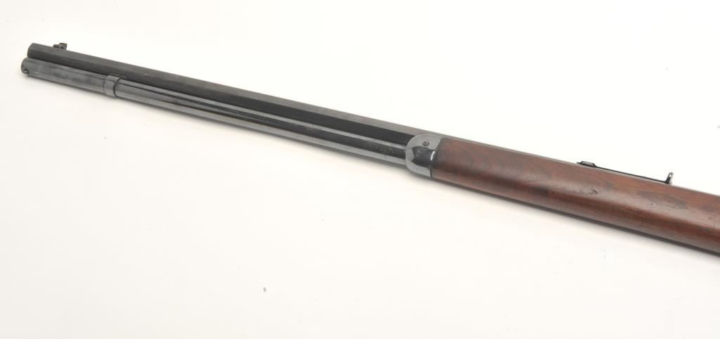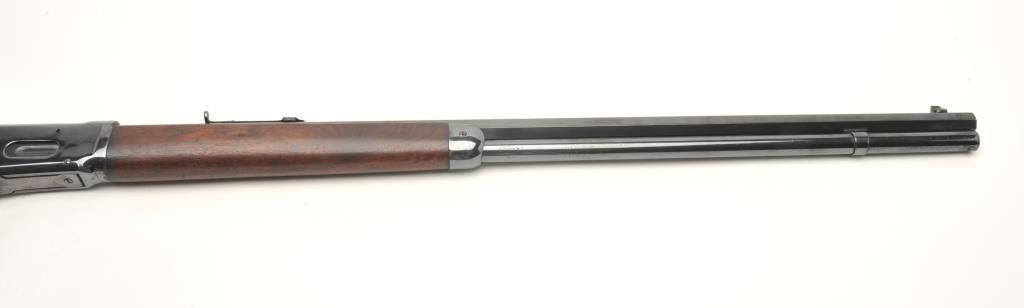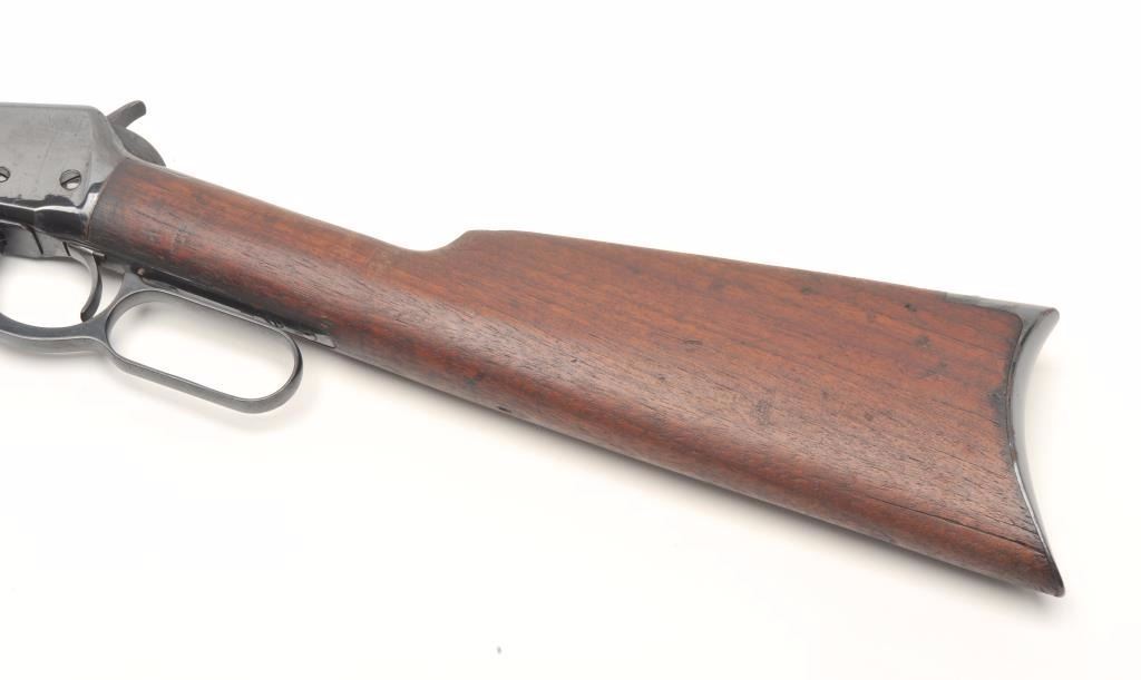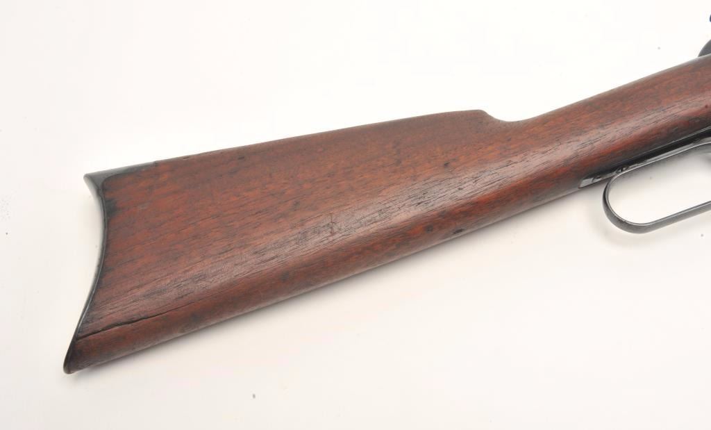 Winchester Model 1894 lever action rifle, .25-35 WCF caliber, serial #NSNV. The rifle is in good overall condition as re-finished. The 26” octagon barrel and full-length magazine retain the majority of an oldre-blued finish. The receiver also retains a significant amount of an old re-blue with some light to moderate surface rust evident, particularly around the front ring and underside of action. The smooth wood stocksare in good condition with a 2” lateral crack at the butt plate. The butt stock ends with a crescent steel butt plate. The bore is rough but may clean; action functions and the markings are legible except for the serial#. (C+R) Est.: $400-600.