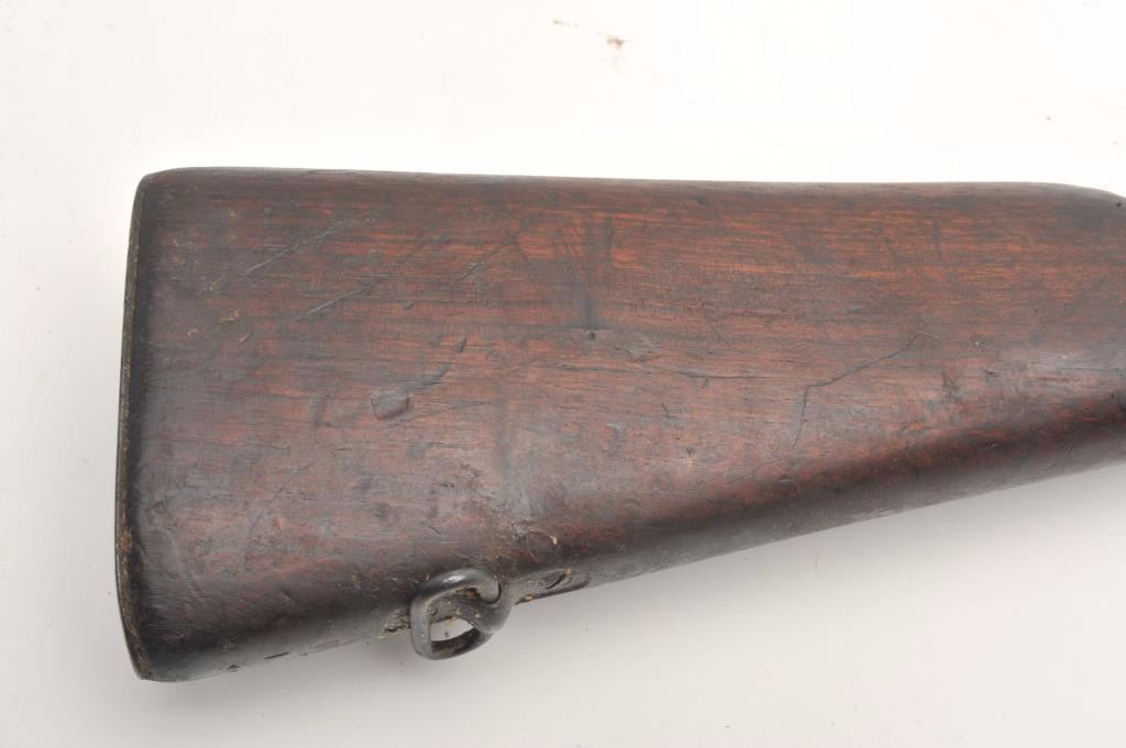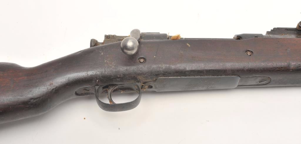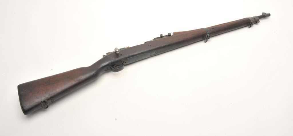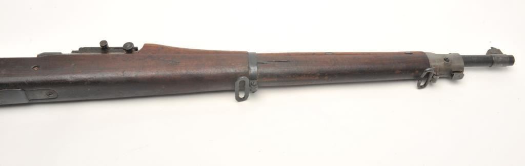 Rock Island Arsenal U.S. Model 1903 bolt action rifle, .30 caliber, serial #379037. The rifle is in good overall condition with a 24” barrel with a blade front and military ladder style rear sights. The barrel andreceiver retain the majority of their military finish with significant residual packing grease evident. The Rock Island marked barrel is dated 12-18 with the flaming bomb emblem. The smooth wood stock is darkshowing storage marks, dents, compressions and significant old grease. The stock includes sling swivels and ends with a checkered steel butt plate with trap. The bore is fair and may clean, the action iscrisp and markings are sharp. (C+R) Est.: $250-$500