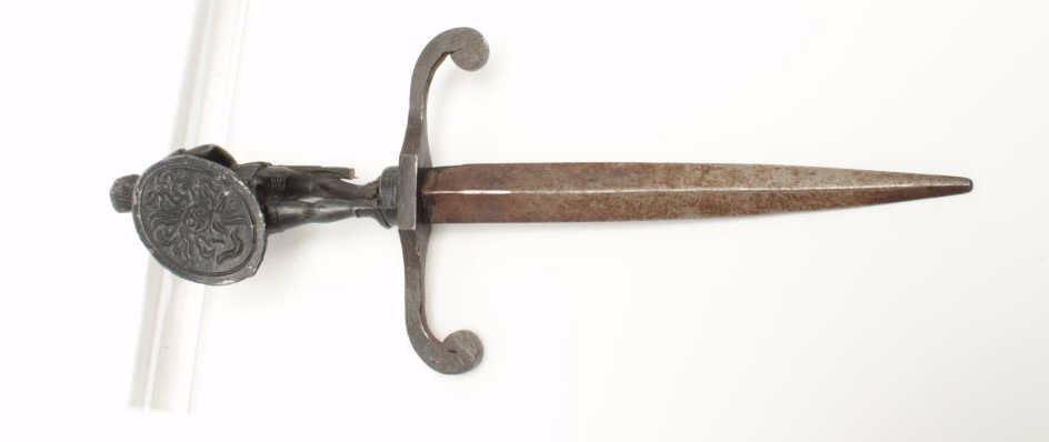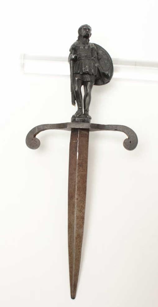 Victorian era dagger with cast bronze grip of Celtic warrior. Approximately 10” overall with a 6” blade. Great patina and very good plus overall. Point slightly blunted. Est.: $250-$500