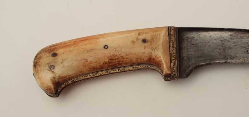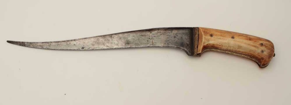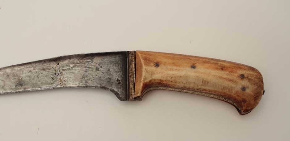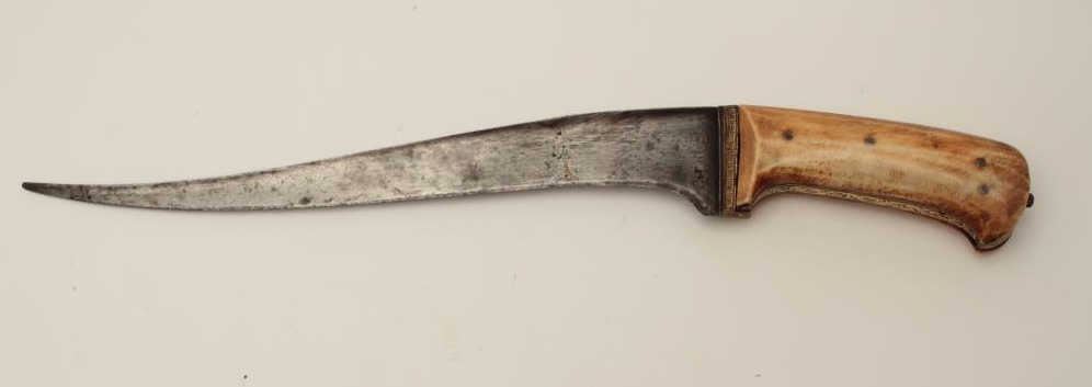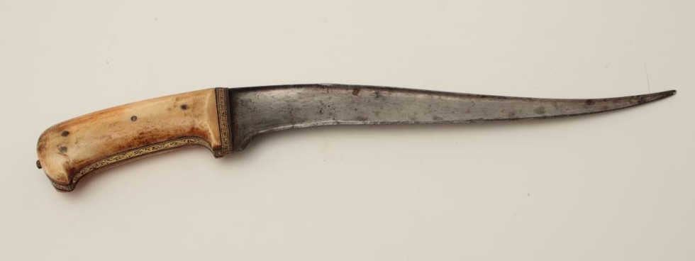 19th century mid-eastern dagger with gold damascened decoration and ivory grip. Measures 14 ¾” overall with a 10 ½” curved blade. In good overall condition showing minor pitting and sharpening. A quality blade with reinforced and thick back or spine. Est.: $350-$700