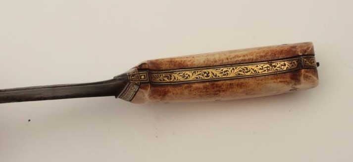 Lot 1925 19th century mid-eastern dagger with gold damascened decoration and ivory grip. Measures 14 ¾” ove