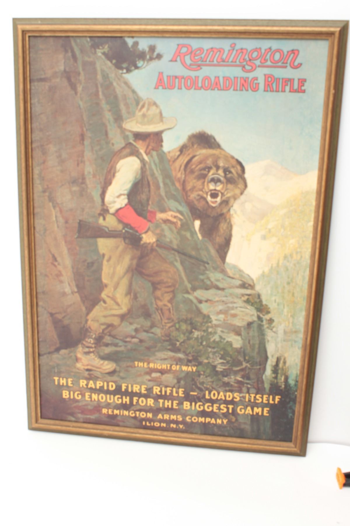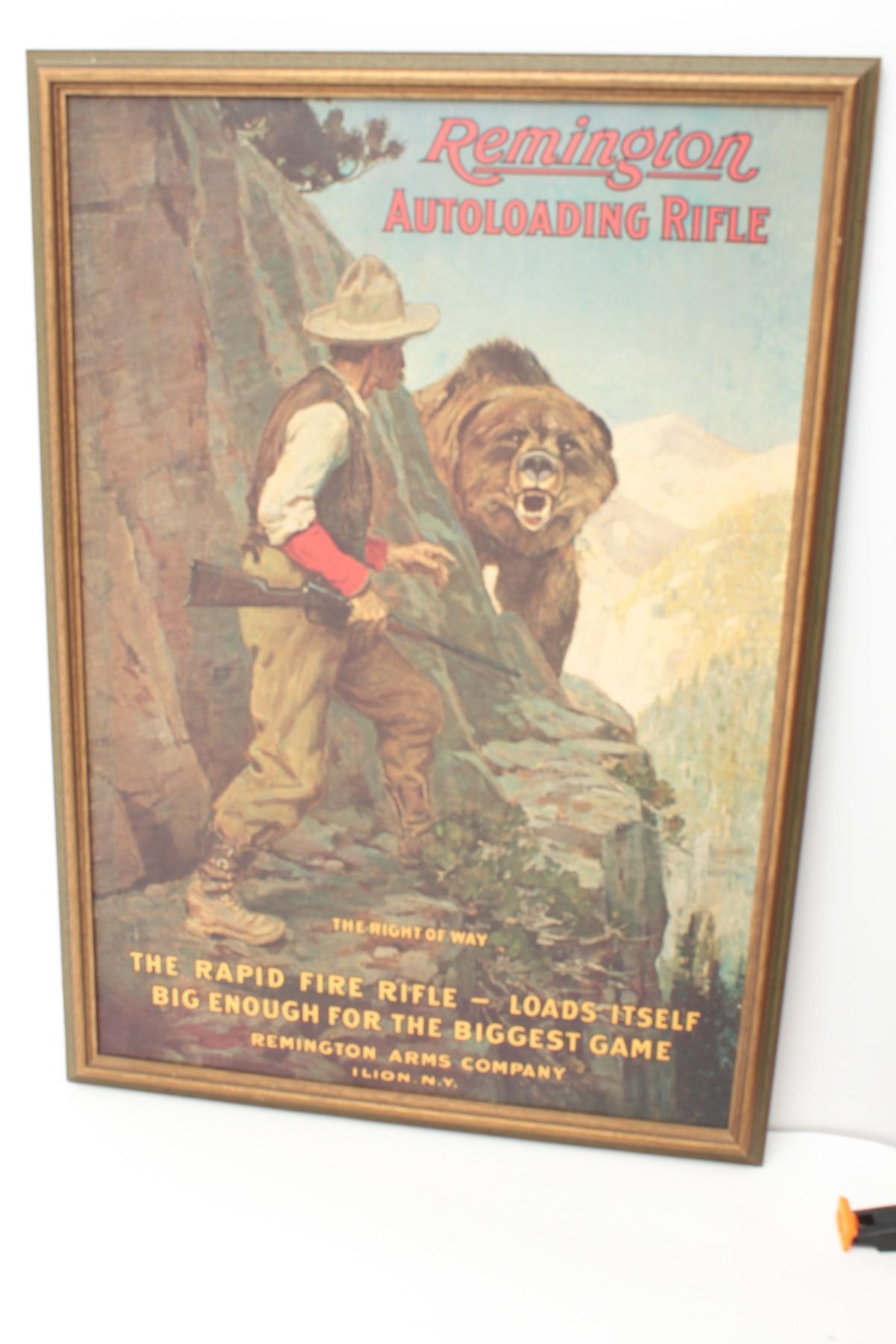 Modern reproduction of a Remington advertisement. A framed advertisement for the Remington auto loading rifle depicting a hunter and grizzly bear, titled, “The Right of Way”, it measures 19” by 26” with a greenand gold wooden frame. The picture is in good condition with no damage and would benefit from a cleaning. A nice decorator piece for the gun room. $50-$100.