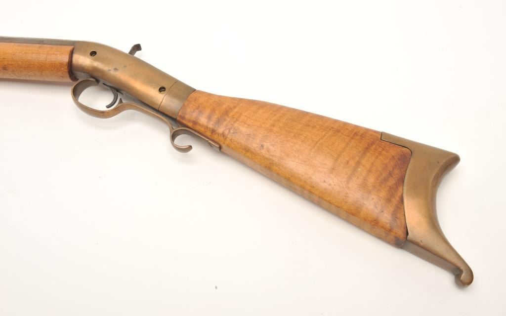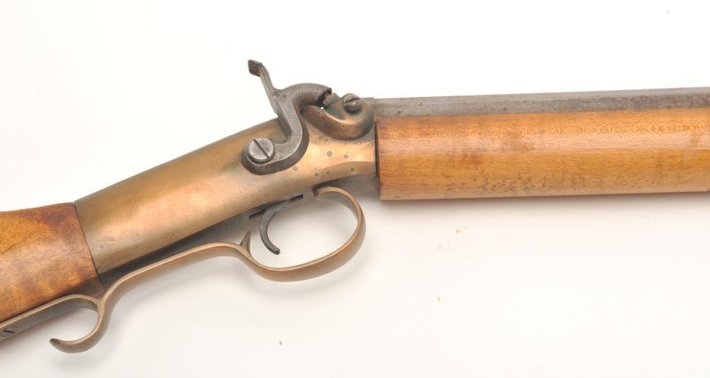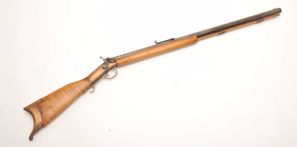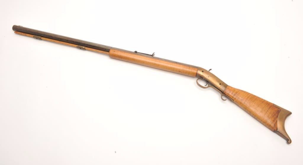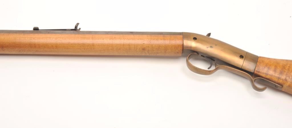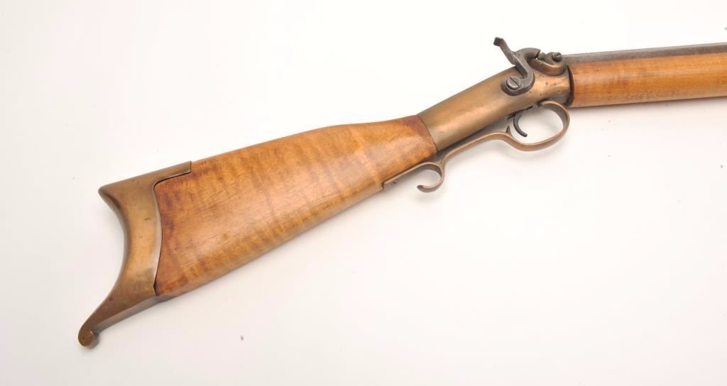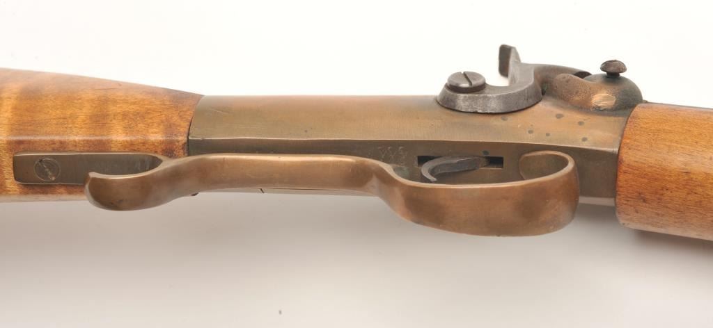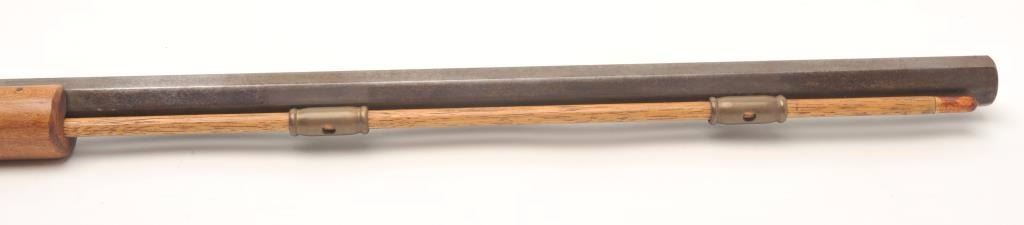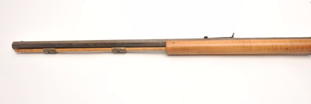 Mowrey reproduction black powder percussion rifle, .54 caliber, serial #8253. The rifle is in very good overall condition with a 32” octagon barrel with a silver knife blade front sight. The barrel has gone to brownpatina with light surface rust noted. The action has toned nicely as the brass has taken on a pleasing color and a brass tipped wooden ramrod is included. The smooth wood stock is in good condition with a smooth,brass crescent butt plate. The rifle features all brass hardware and an exaggerated target style brass butt plate. Est.: $175-$350.