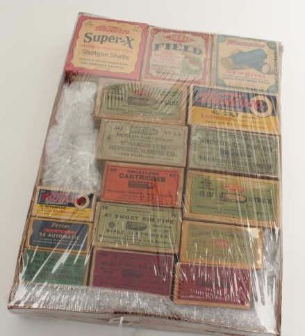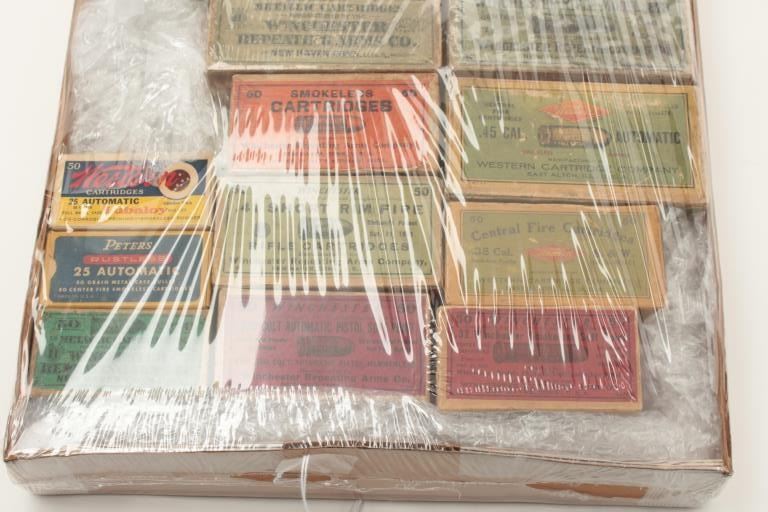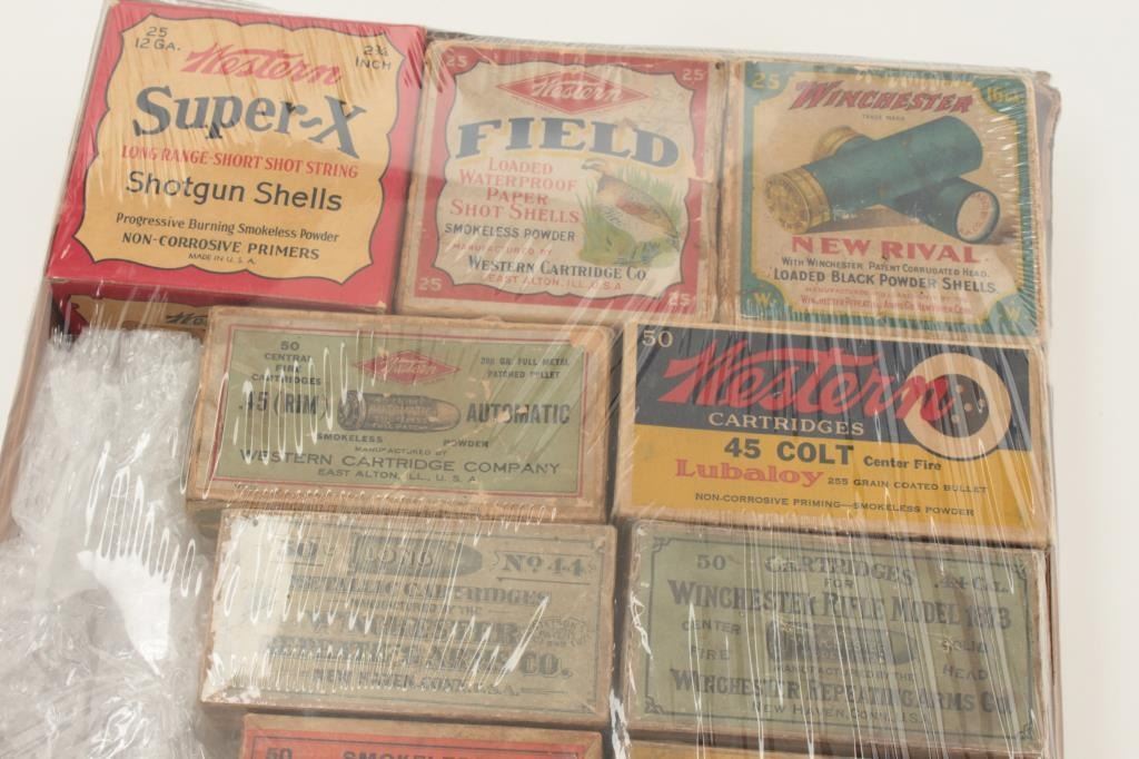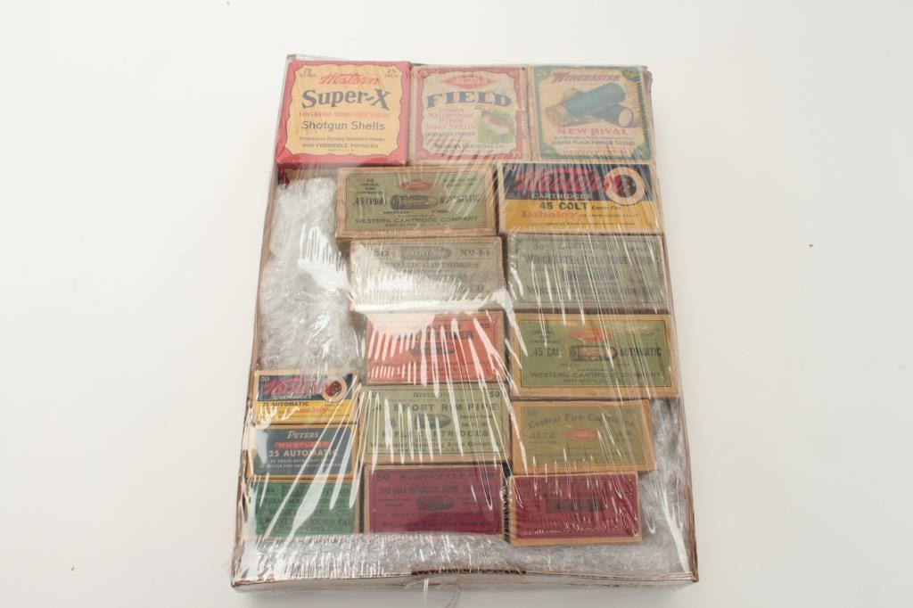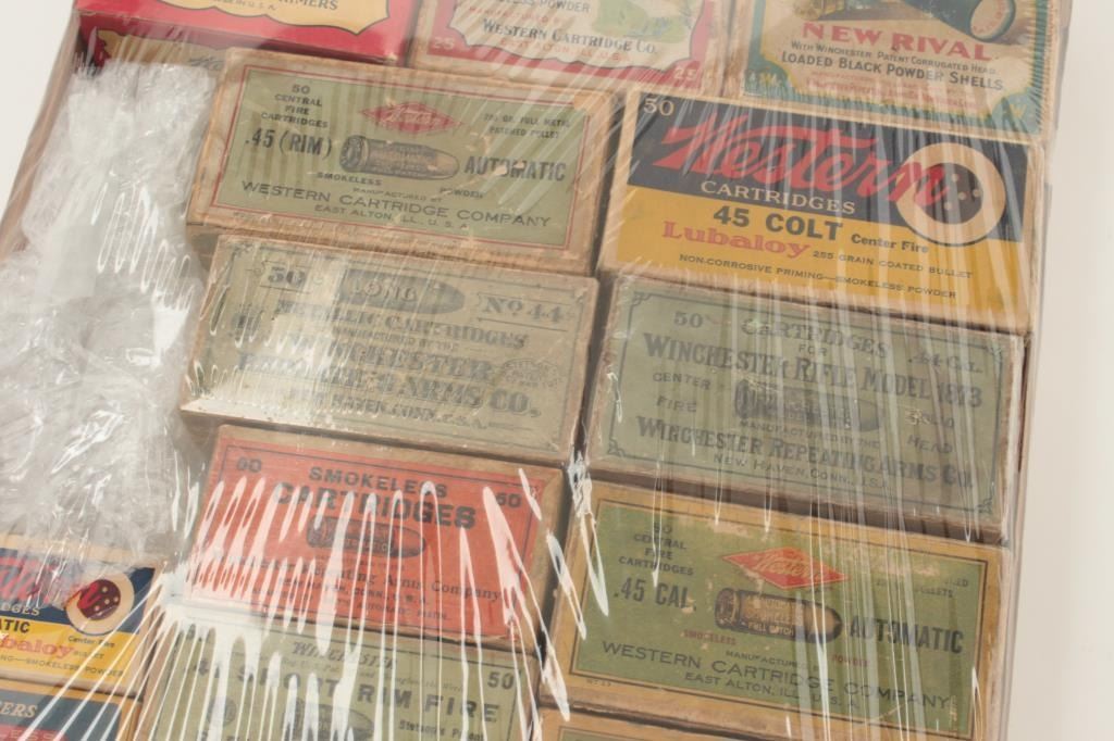 Lot of 16 empty cardboard ammo boxes from 19th to 20th century. Good 1873 Winchester .44-40 box, 2 .45 ACP boxes, 3 shotgun boxes, .41 rim fire box and etc. Nice display for a gun room. Fair to very good overall. Est.:$150-$300