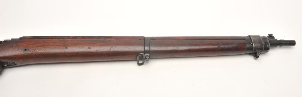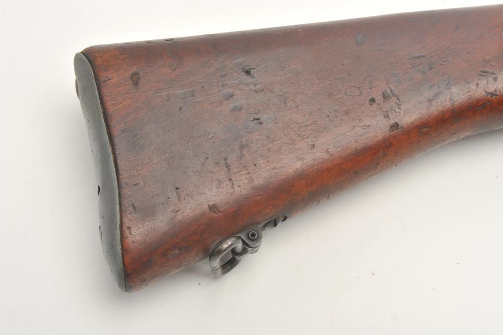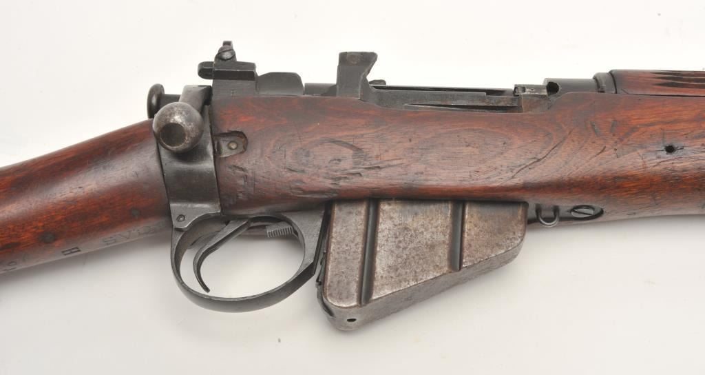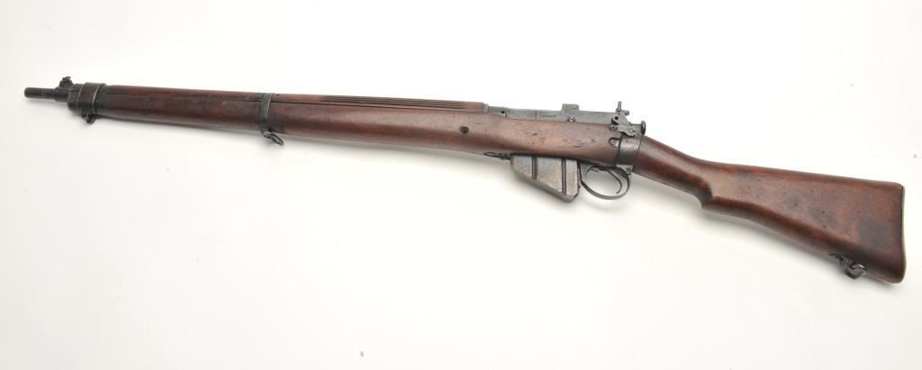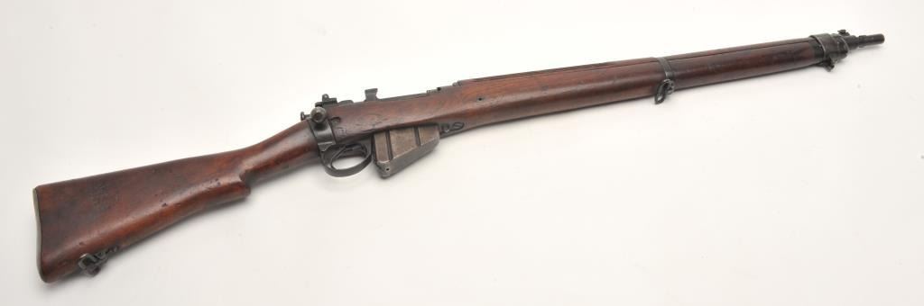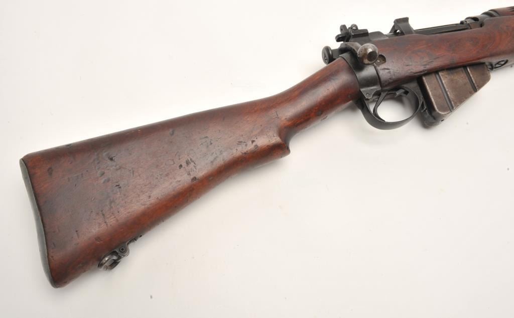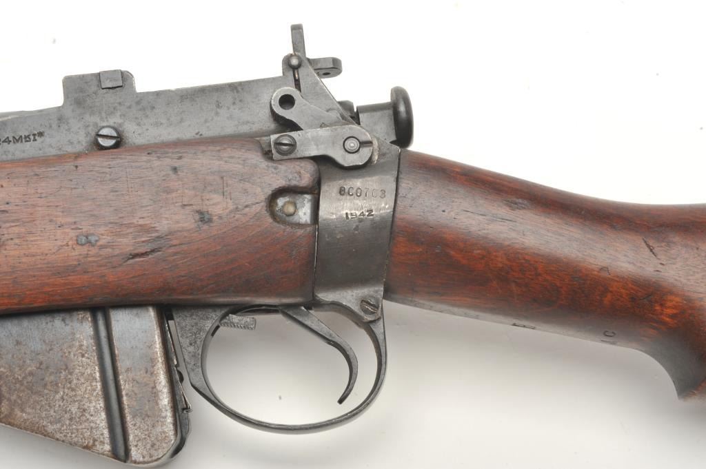 Lee- Enfield No.4 Mk. 1 bolt action rifle, .303 British caliber, serial #8C0703. The rifle is in very good overall condition. The rifle features a 25” barrel with a ramp front and aperture rear sights. The barreland action retain a significant amount of their military finish with dried oil and light surface rust evident. The action is dated 1942. The smooth wood stock shows moderate to heavy use with bruises andcompressions and some extra holes. The butt stock includes sling swivels and ends with a smooth metal butt plate with trap. The bore is poor, the action crisp and markings are sharp. (C+R) Est.: $200-$400.