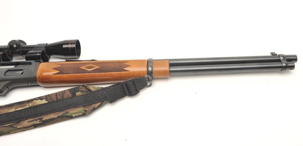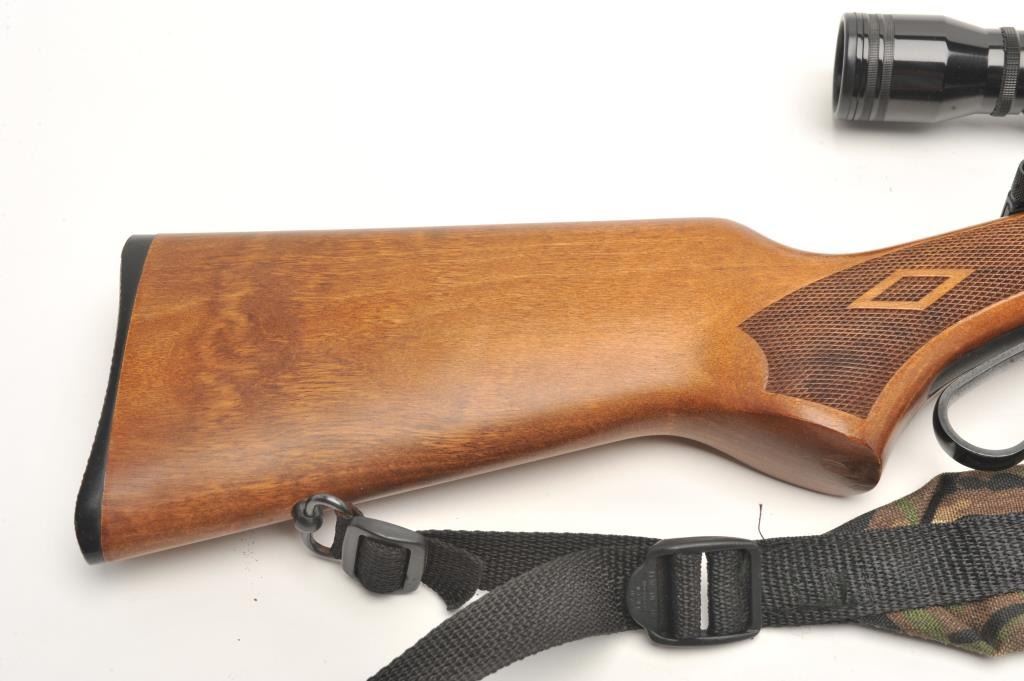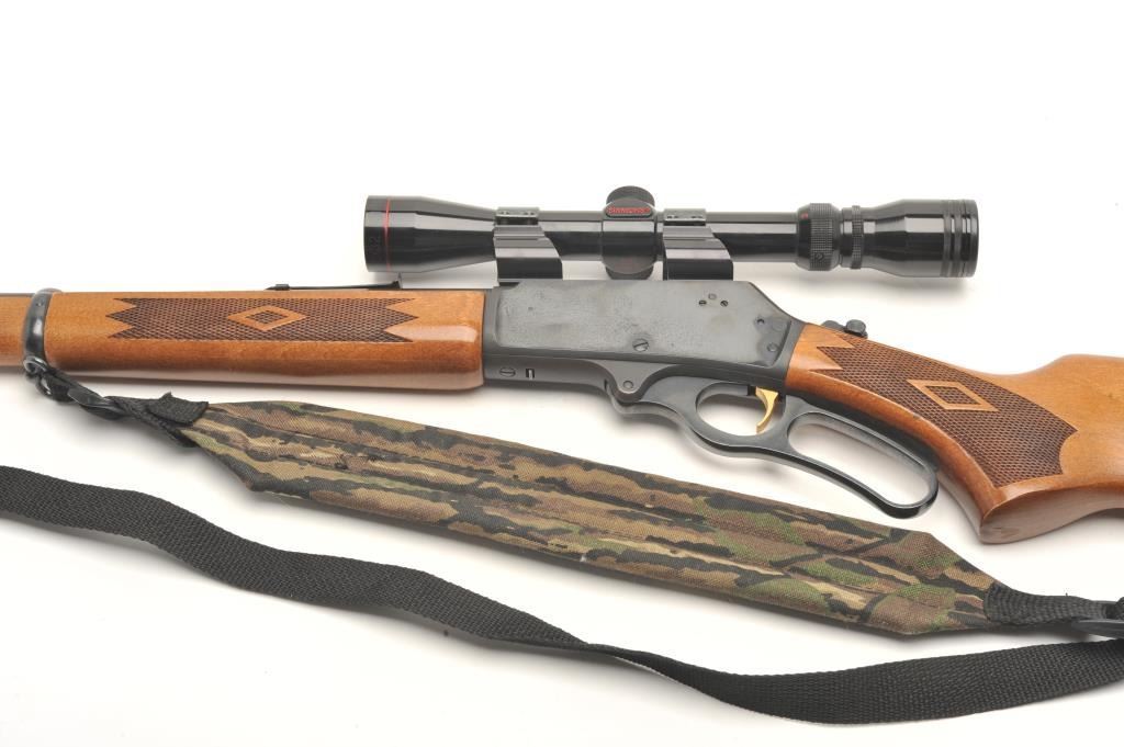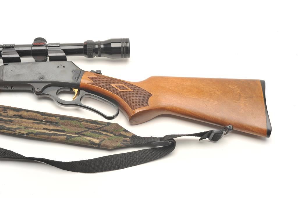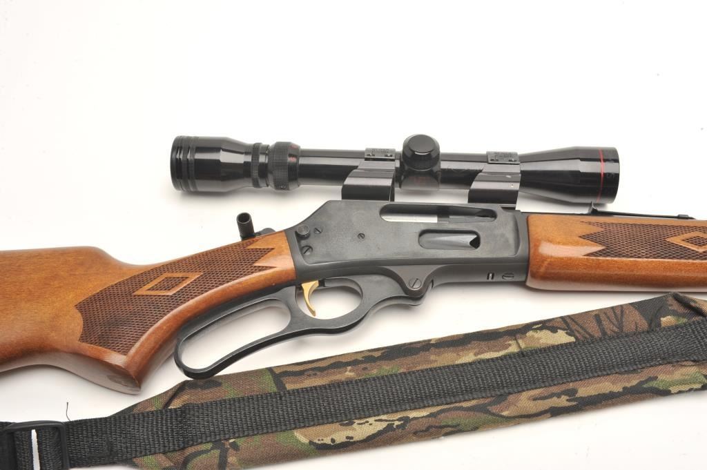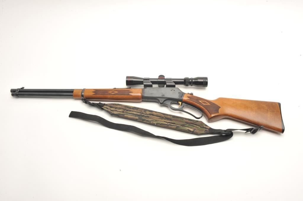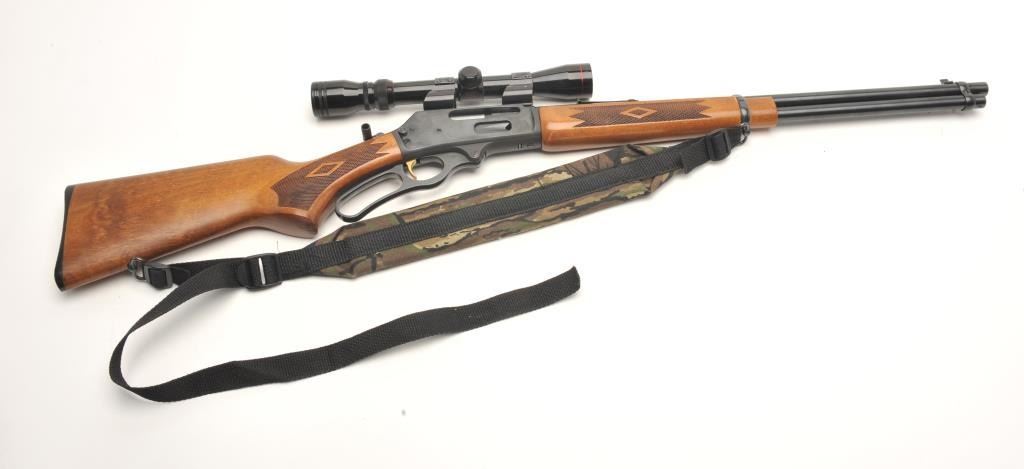 Marlin Model 30AW lever action rifle, 30/30 Winchester caliber, serial #03043595. The rifle is in very good overall condition with a 20” round barrel and full-length magazine. The barrel, magazine and receiver all retain the majority of their blued finish with light surface rust evident on the top of the barrel as well as the action. The checkered wood stocks are in very good condition with only light storage marks. The butt stockends with a checkered plastic Marlin marked butt plate. The rifle is topped with Weaver look-thru mounts and a Simmons 3x9x32 variable power scope. The bore is good, the action crisp and markings are sharp. Thelot includes a camo sling as well. (Modern) Est.: $250-$500.