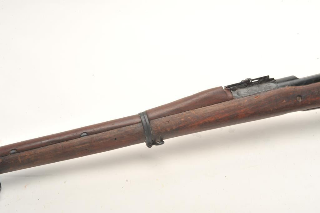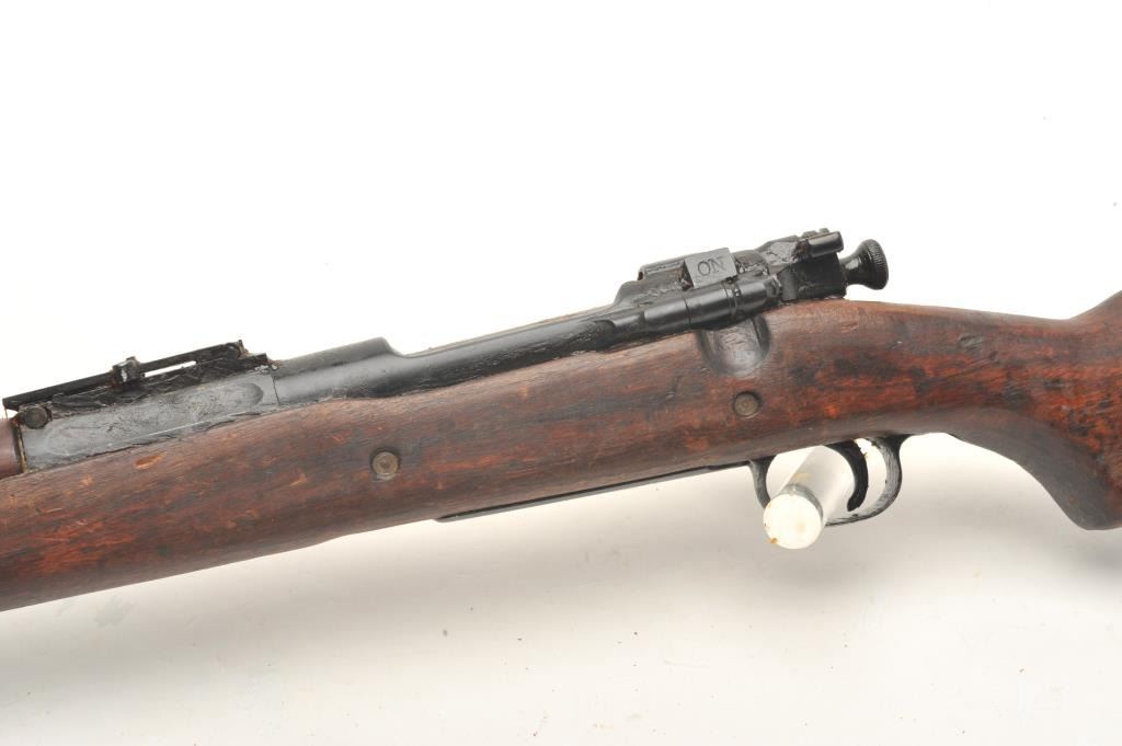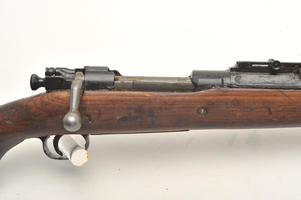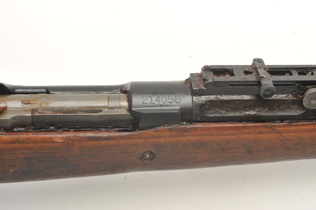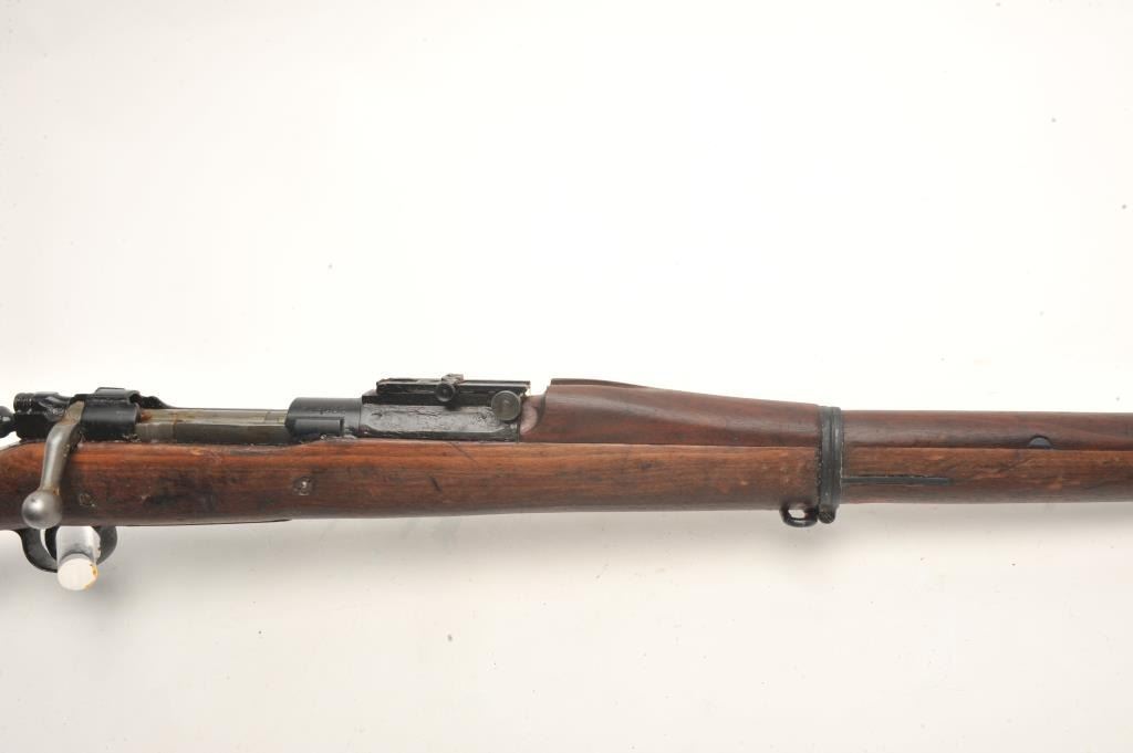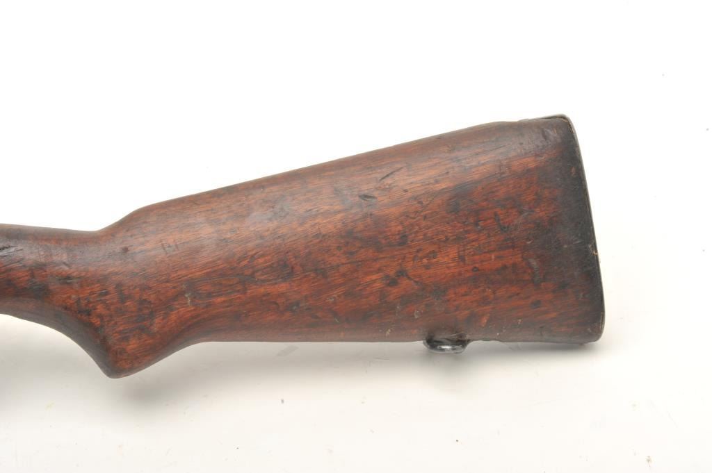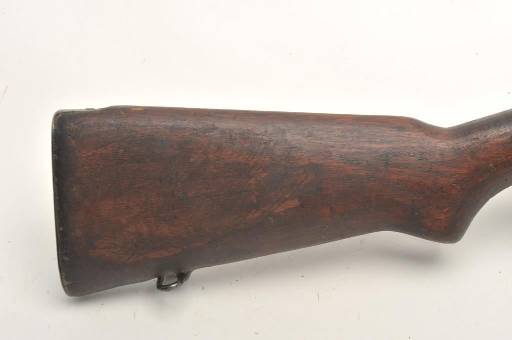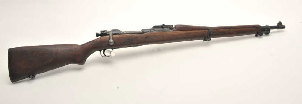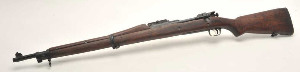 Rock Island Arsenal U.S. Model 1903 bolt action rifle, .30 caliber, serial #214056. The rifle is in good overall condition with a 24” barrel with a blade front and military ladder style rear sights. The barrel andreceiver retain the majority of their military finish with significant residual packing grease evident. The barrel is marked “AV” and is dated 2-19 with the flaming bomb emblem. The smooth wood stock is darkshowing storage marks, cartouches on the underside of the butt stock and significant extra grease. The stock includes sling swivels and ends with a checkered steel butt plate with trap. The bore is fair and mayclean, the action is crisp and markings are sharp. The lot includes the CMP certificate of authenticity provided at purchase. (C+R) Est.: $250-$500