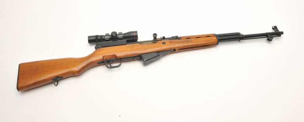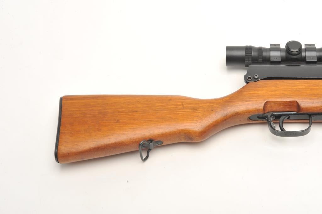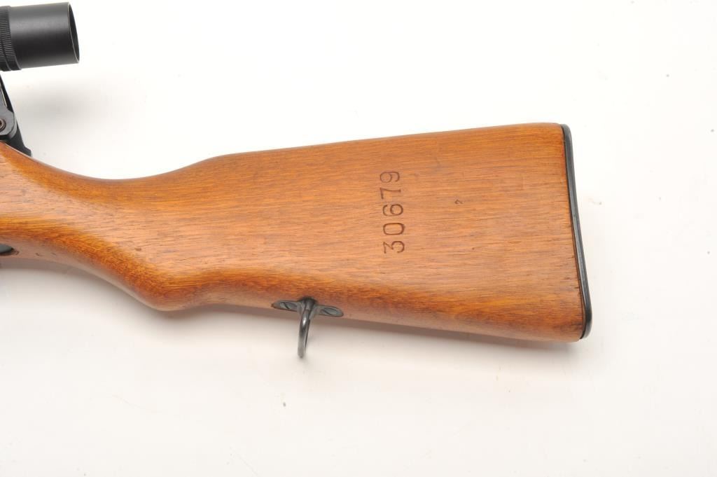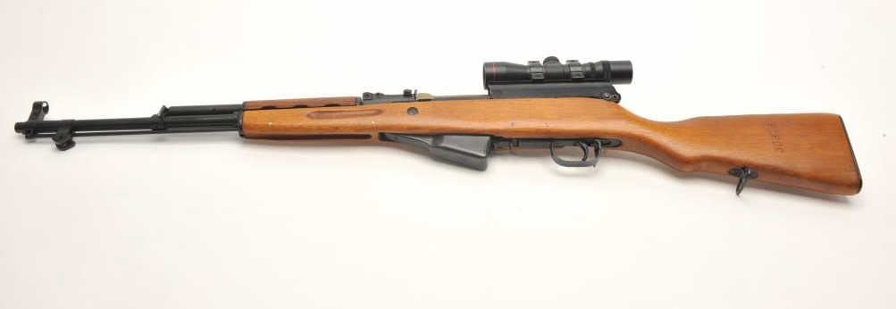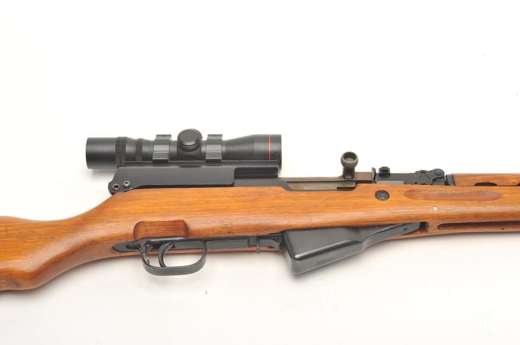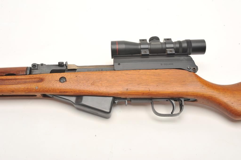 Chinese SKS semi-auto rifle, 7.62 x 39 caliber, serial #2100XX. The rifle is in very good overall condition with a 20” barrel with hooded front and military style tangent rear sights. The barrel and receiver retain nearly all of their military finish with only minor storage marks noted and Chinese characters on the side of the receiver. The smooth wood stock is in good condition showing small mars and handling marks. Thebutt stock ends with a smooth steel butt plate with trap. The rifle is topped with a B-Square scope mount and Simmons SKS 4x fixed power scope. The chrome lined bore is very good, the action crisp and markings aresharp. (Modern) Est.: $200-$400.